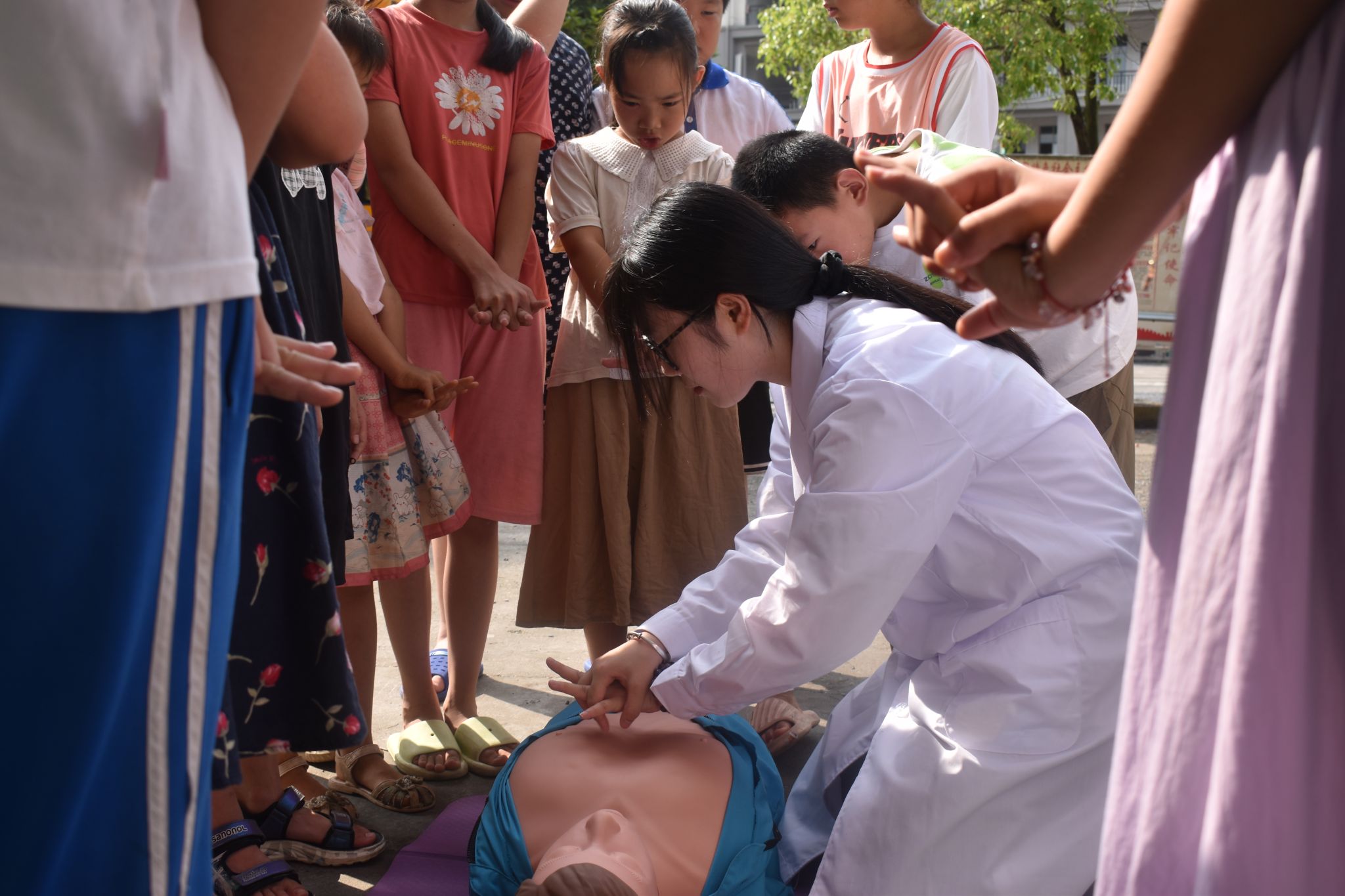 此次课堂还设置了心肺复苏实操环节。实践团成员结合专业知识,现场演示了胸外按压、人工呼吸的标准动作,并组织孩子们分组练习,一对一纠正动作细节。