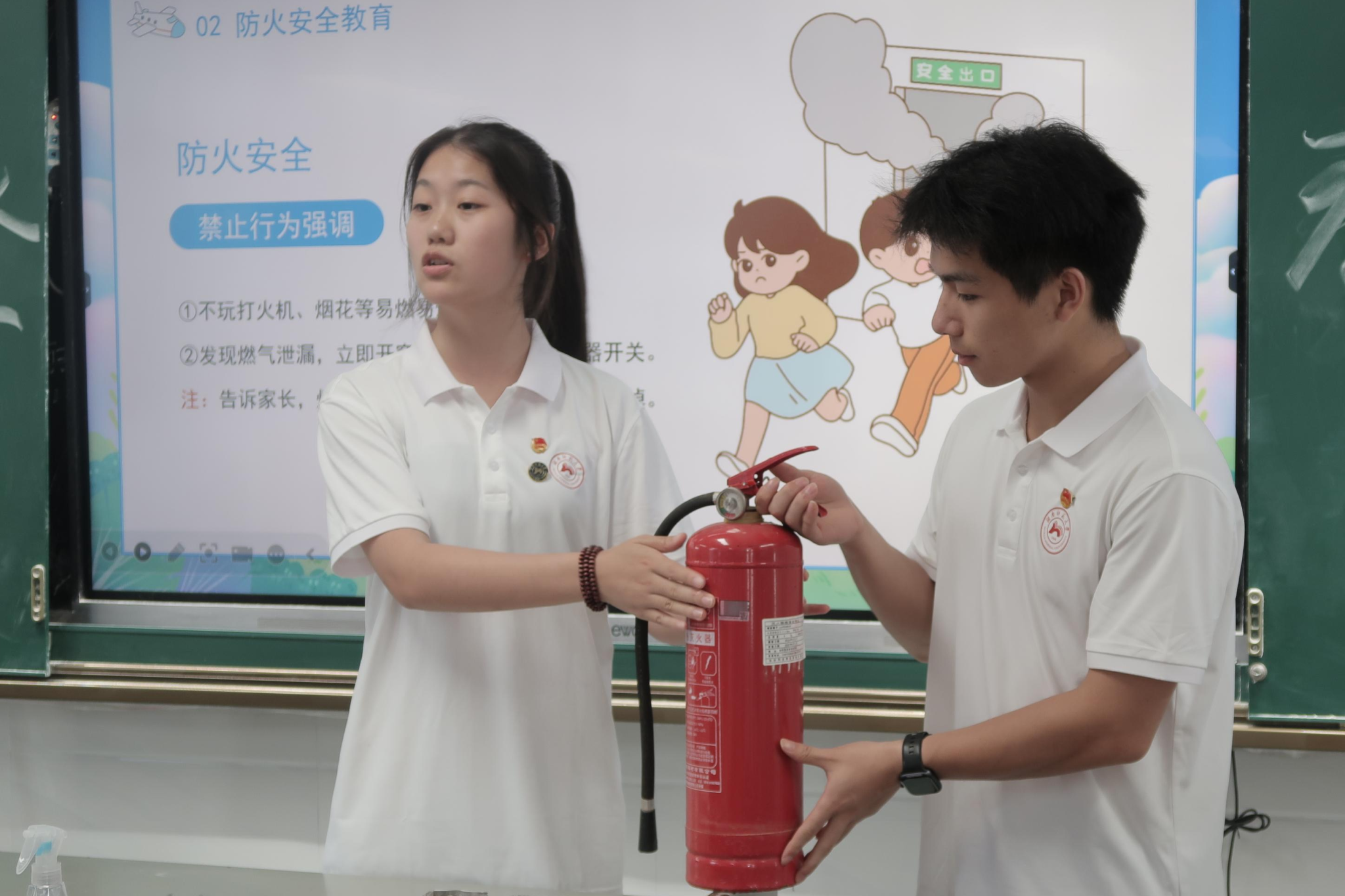 “安全应急演练”知识课堂主讲人运用内容讲解、视频案例分析与互动问答相结合的形式传授安全常识与急救技能。在讲解消防安全知识时,实践团成员聚焦灭火器使用要点,进行细致讲解与现场演示。从提握方法到喷射步骤,二人分步拆解、实操示范,强化学生火灾应对实操能力。