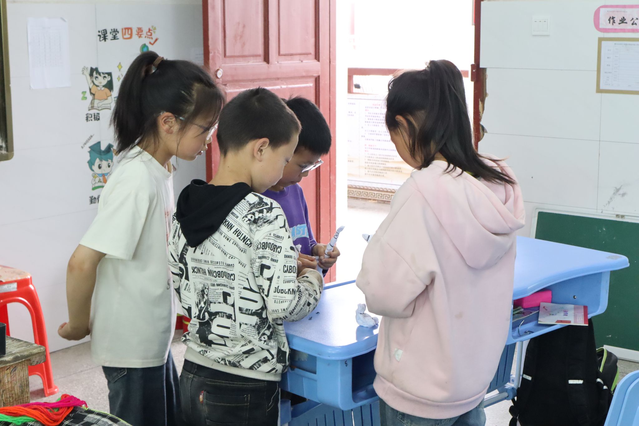 学生们相互讨论扎染技法和色彩搭配