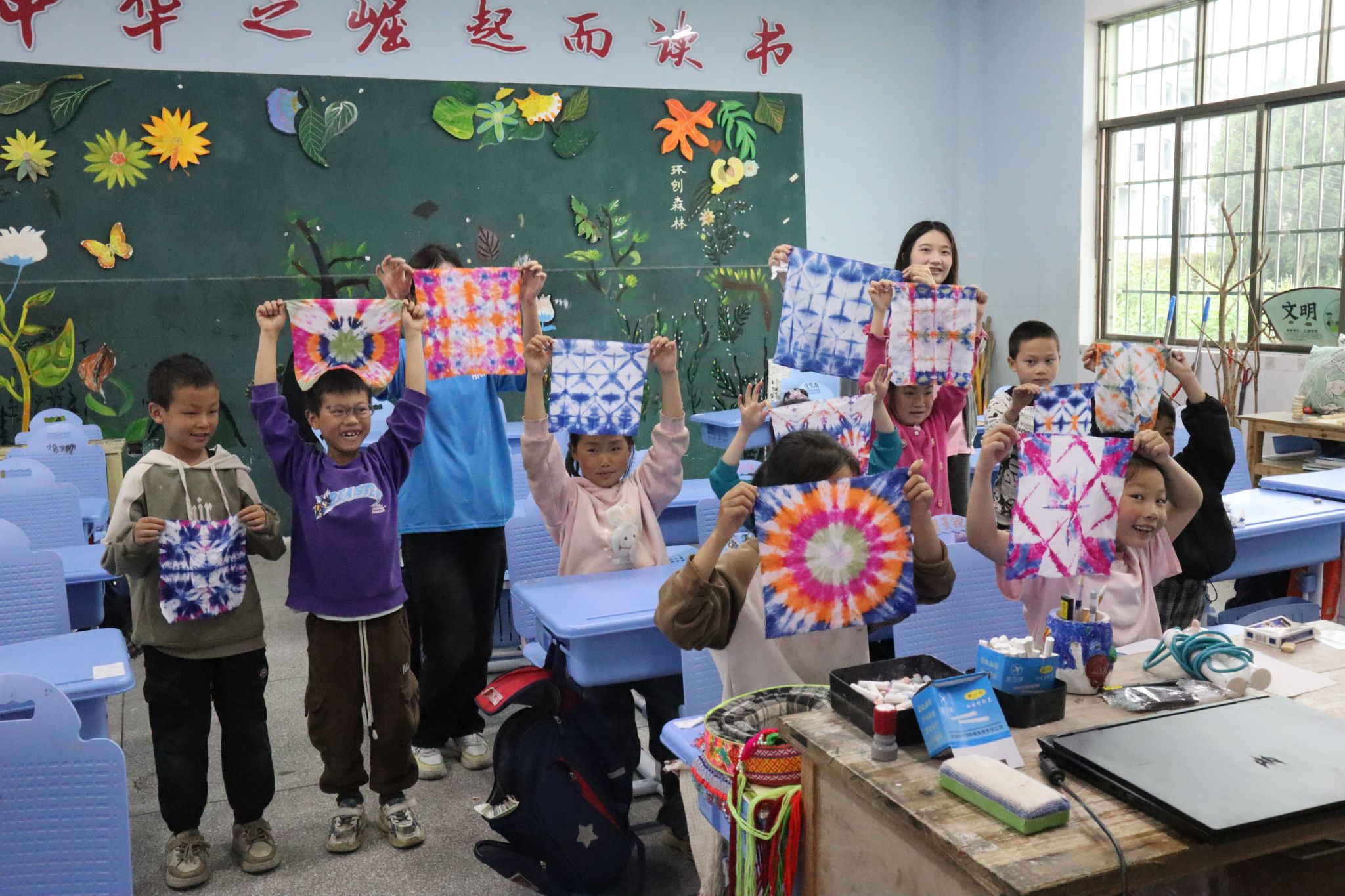 学生们展示扎染作品