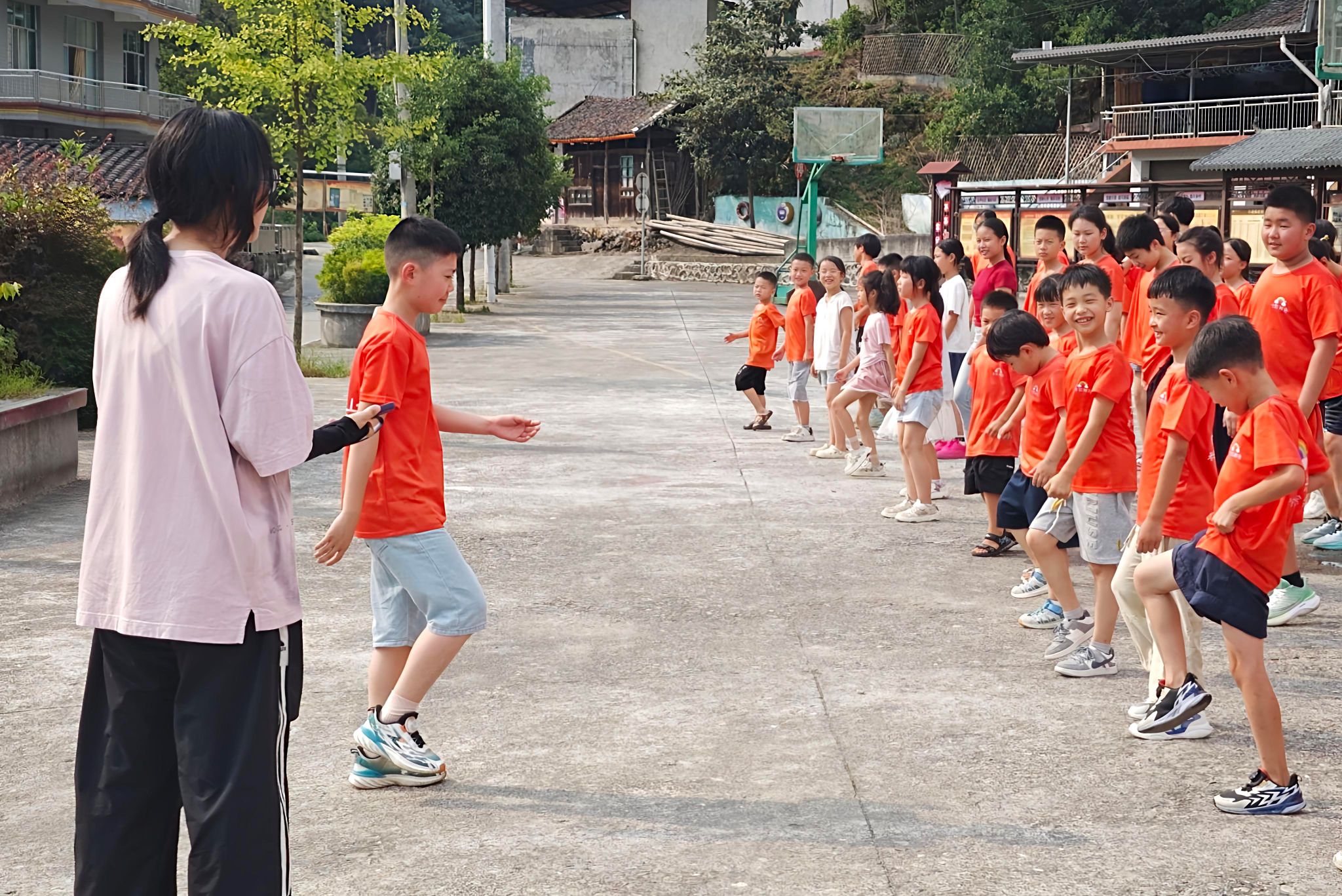 在实践提升部分,实践团队员采用分组教学模式。在篮球教学中,初学组进行运球、传球等基础训练;提高组则通过组织半场对抗赛,提升反应速度与团队协作能力。此外,课程设计融合潇湘文化与当地山区特色。实践团队员汲取“打鱼放鸭”的生产姿态、梅山武术动作等梅山文化元素,创编《小城夏天》韵律操并进行分段教学;组织“穿越隧道”团体游戏,传递同舟共济、勇于探索、志在远方的理念。