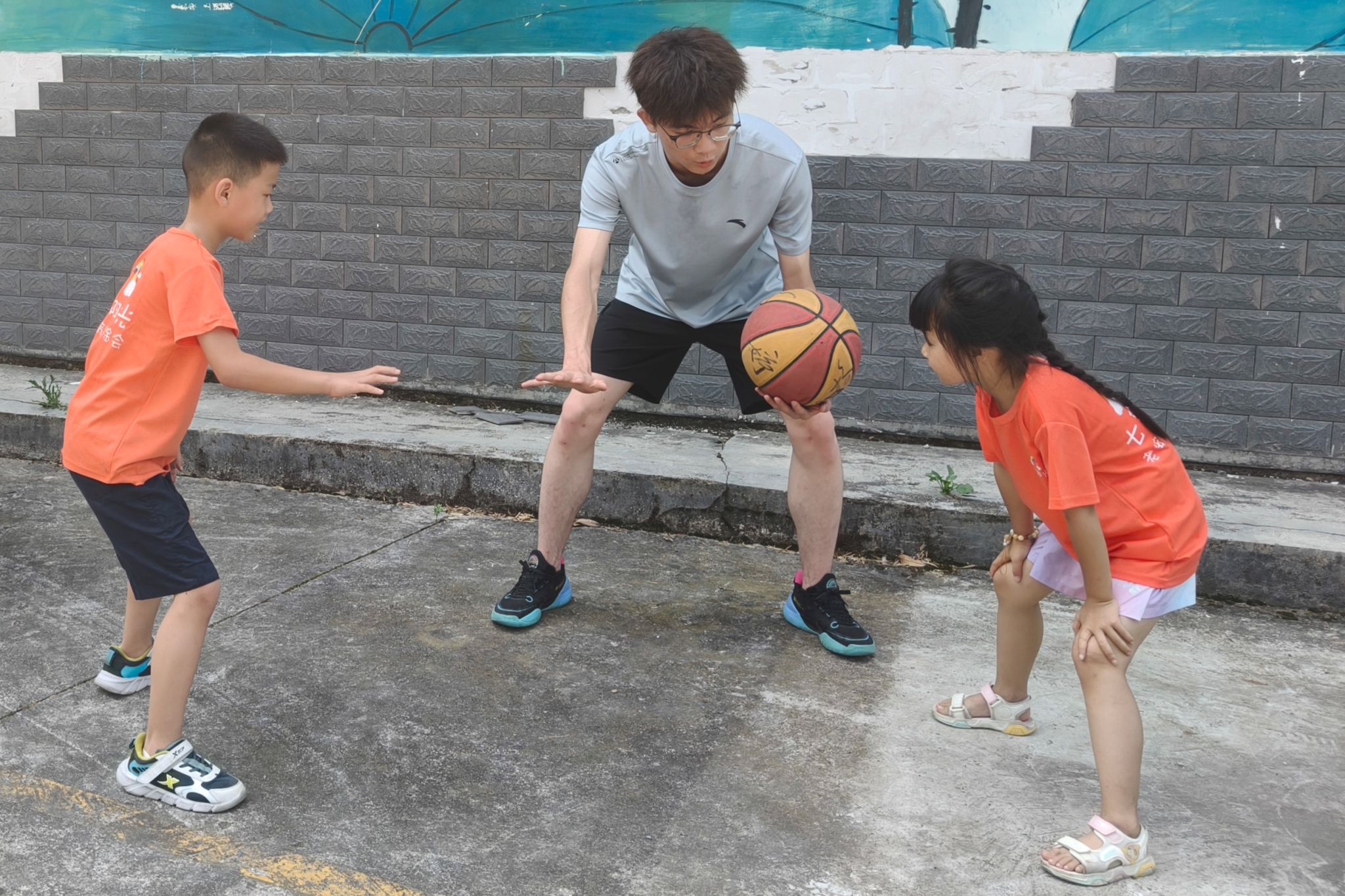 实践团队员向学生讲解篮球技巧