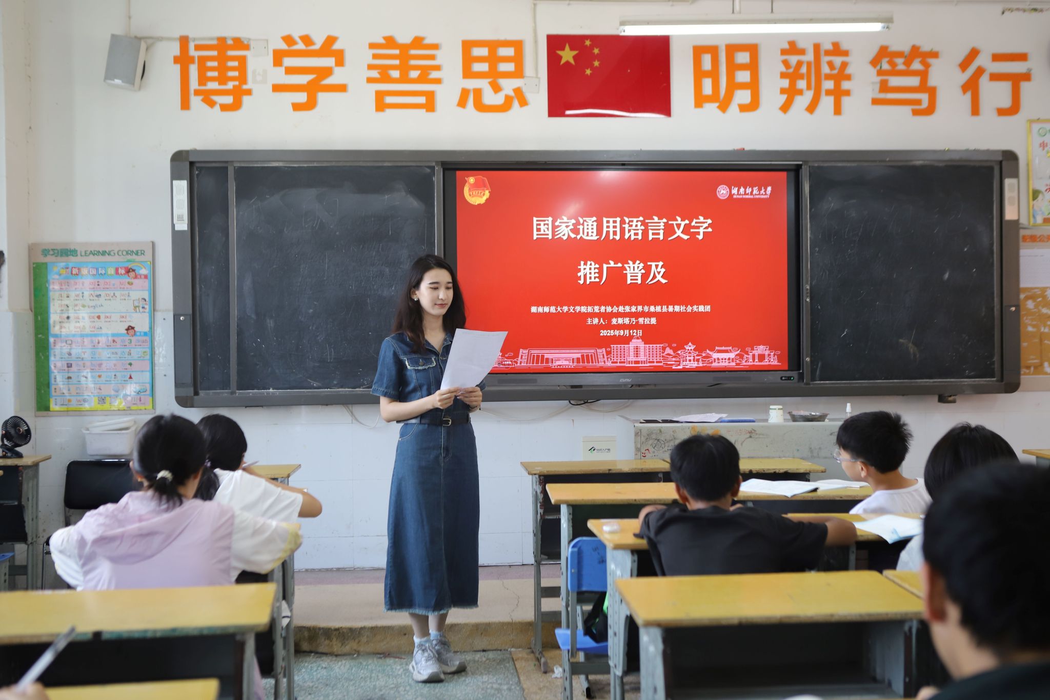 (通讯员 吕知函)为深入贯彻落实国家通用语言文字推广政策,助力乡村教育振兴,7月11日上午,文学院“文润澧源”暑期实践团在桑植县思源实验学校创新开展“普通话诵经典”主题语言文化课程。
