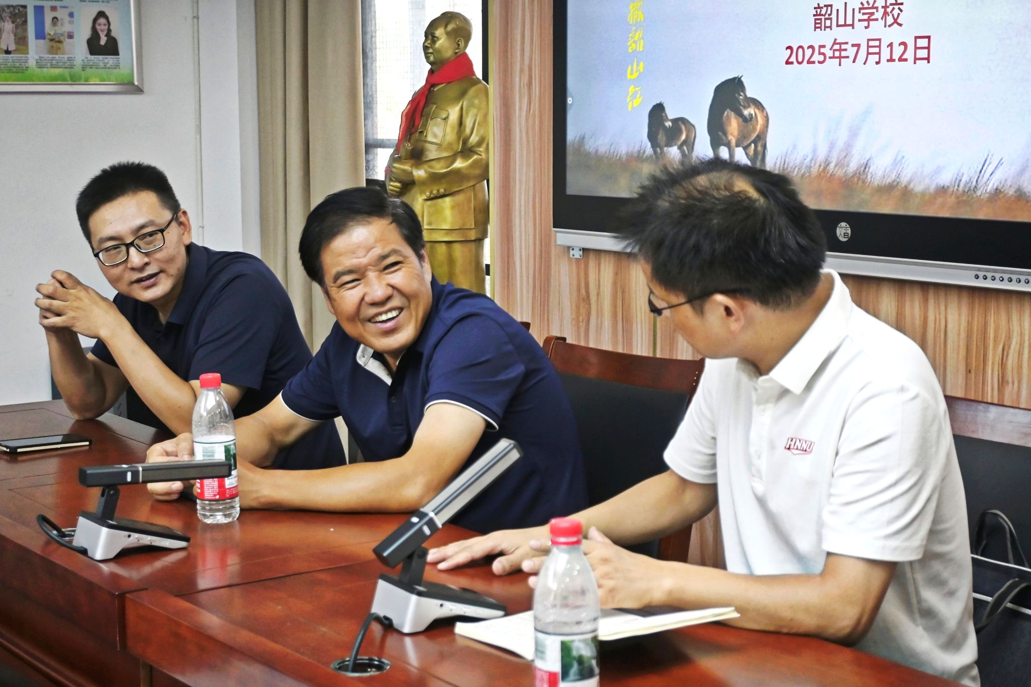 团队负责人介绍了团队的基本情况,表示团队将以“红色文化、湖湘文化、传统文化”为核心为学生开设相关课程,致力于培养学生的文学审美趣味、坚定其文化自信。郭济武对团队的到来表示欢迎,鼓励团队依托跨学科优势,在韶山学校进行学科融合教学,并结合韶山红色文化与特色文化,传承和发扬优良革命传统。吕双伟做总结发言,他对韶山学校的支持表示感谢,激励团队成员在实践过程中发扬师者精神,展现太阳成集团tyc学子的风貌以及奉献品格。同时他希望此次活动能够加深韶山学校与太阳成集团tyc的合作,在实践过程中实现共同发展。