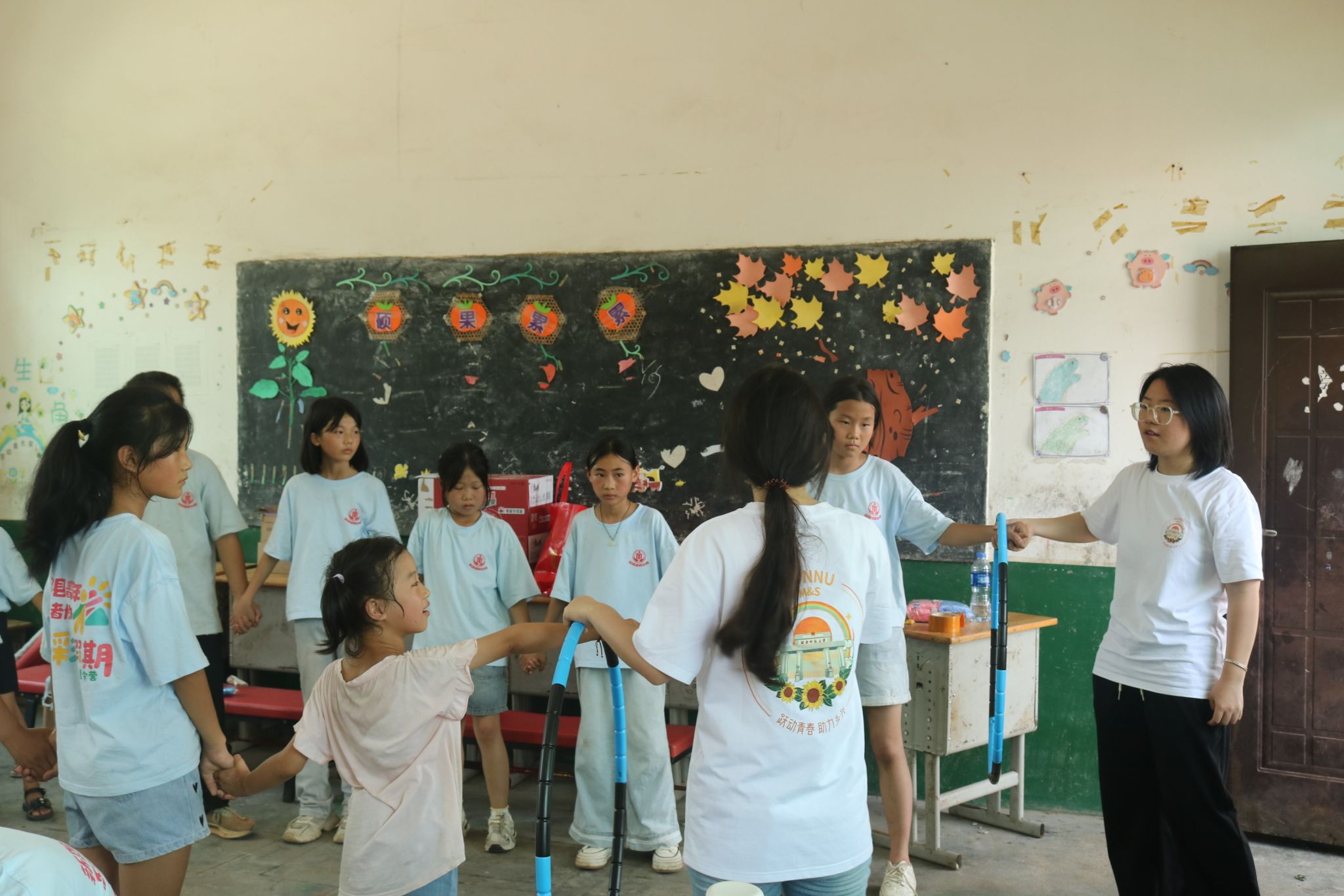 图为实践团成员为学生们讲解“两人三足”活动的规则