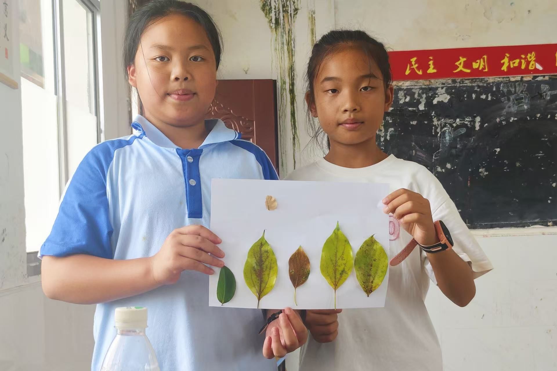 家乡发展系列活动包含“家乡故事会”和“瑶乡巧手”两个子活动。“家乡故事会”以趣味班会形式展开,在“家乡词语接龙”游戏暖场后,主讲人播放视频并在一旁讲解双牌县的历史传说、乡村振兴故事和女书文化,并结合知识问答环节增加互动。学生分组创作“我眼中的双牌”手绘海报,用彩笔勾勒出家乡风貌。“瑶乡巧手”活动聚焦于手工实践,融入环保理念和文化传承。学生利用废旧报纸、布料、树叶等材料,创作“家乡新风貌”主题拼贴画,制作女书字符书签。活动中,实践团队员巡回观察,确保安全有序。