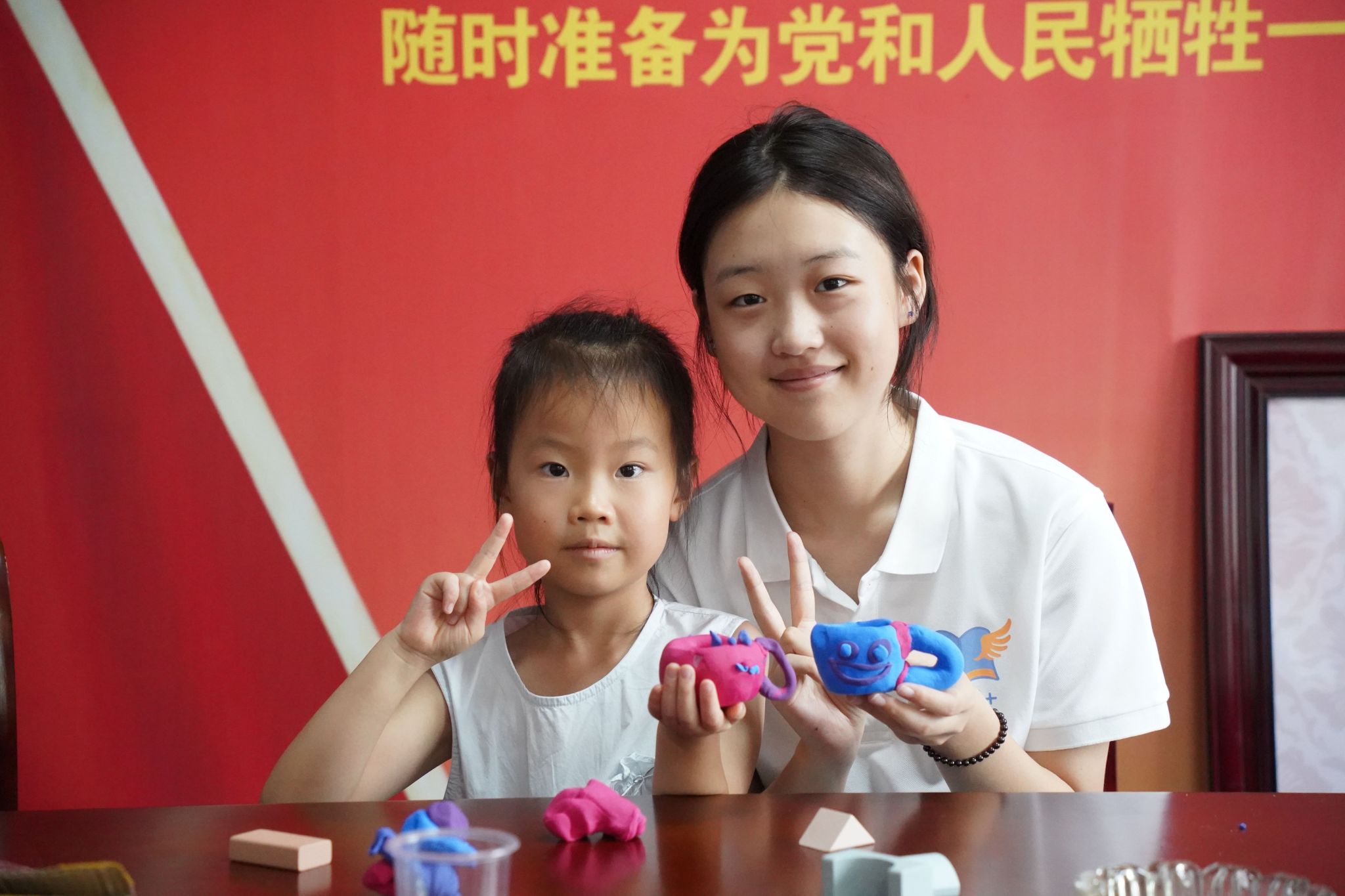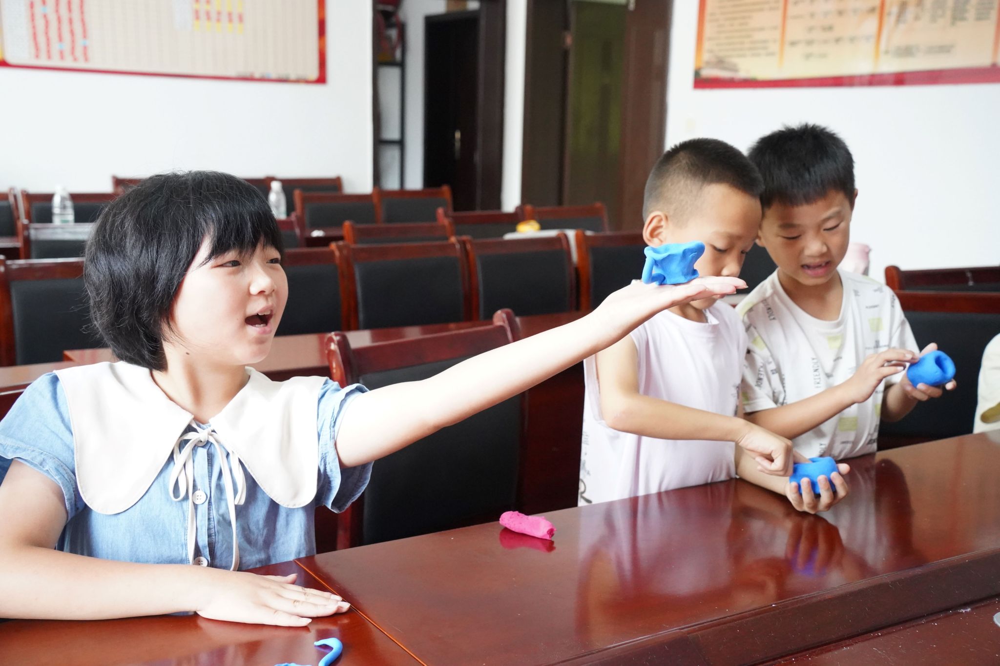 教学组成员教学生制作黏土茶具