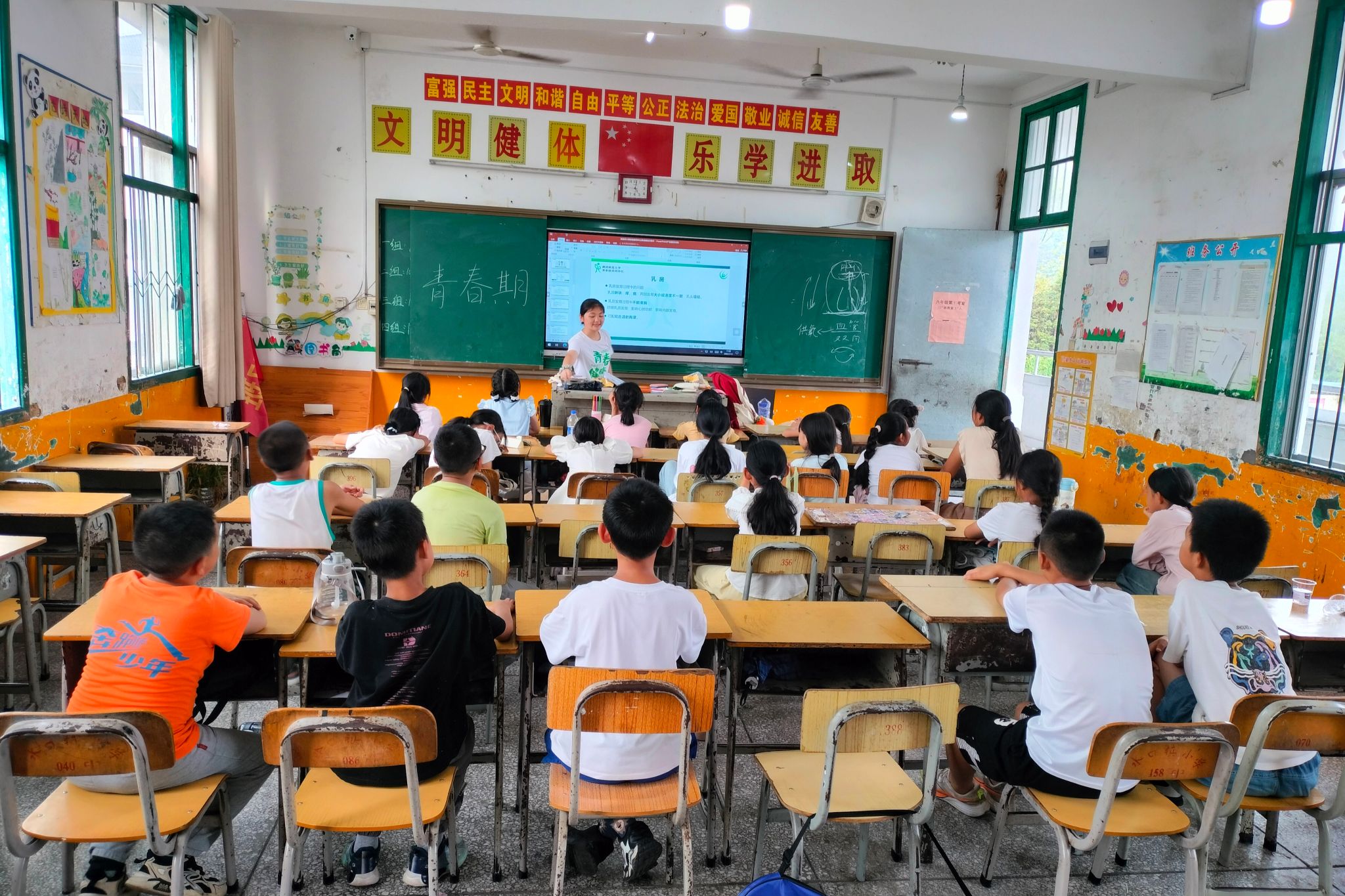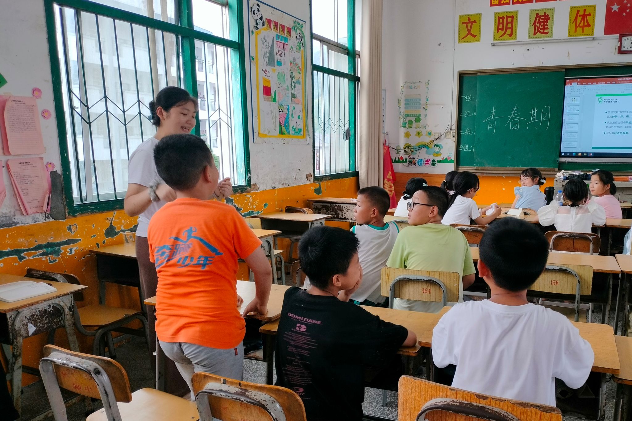 基于问卷结果的整理与分析,实践团成员运用适合儿童的科普图片和动画进行讲解,向学生介绍生命孕育原理、人体主要器官的功能分类及青春期出现的身体变化特征,并适时穿插提问,引导学生思考与巩固所学知识。