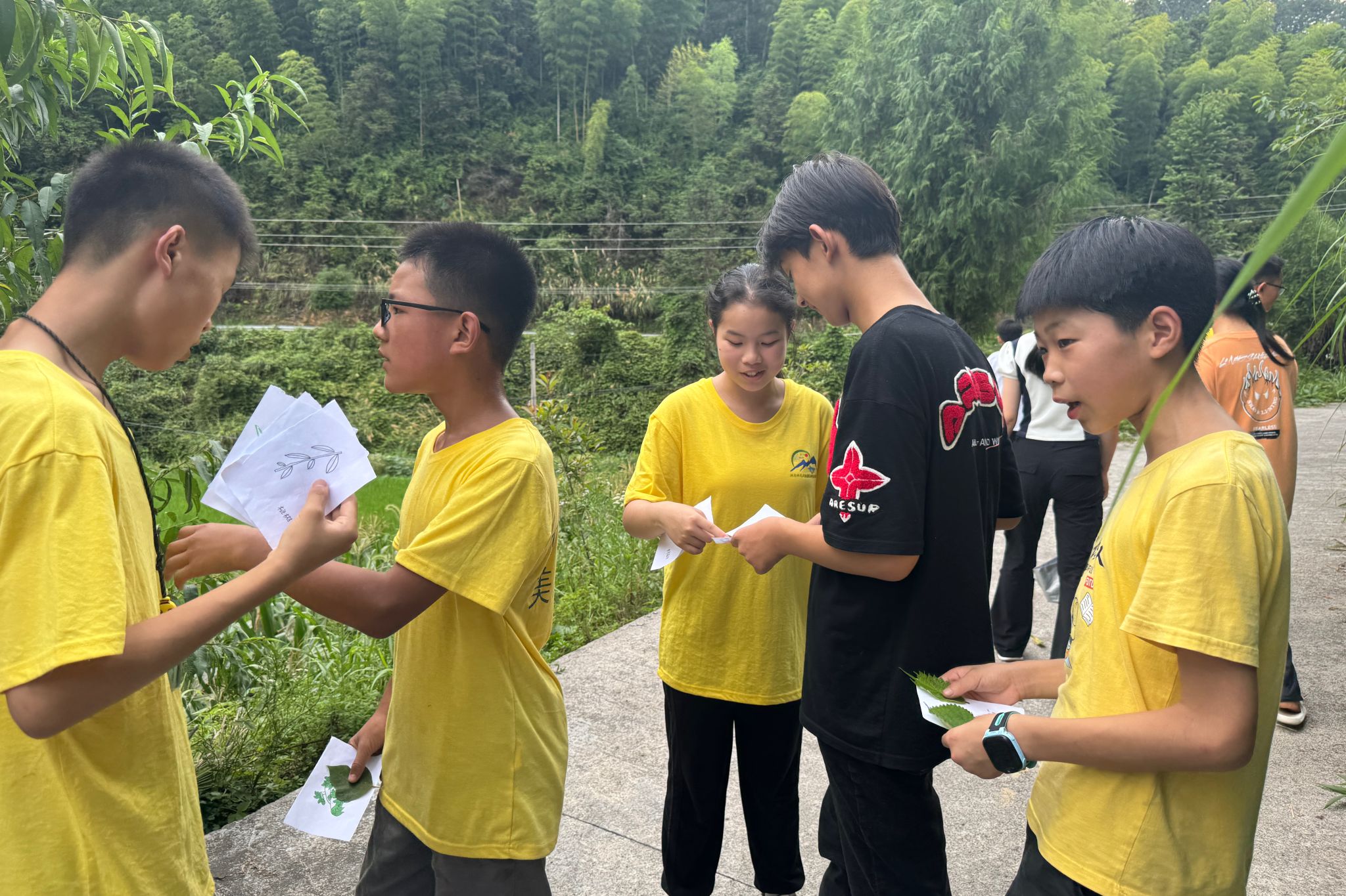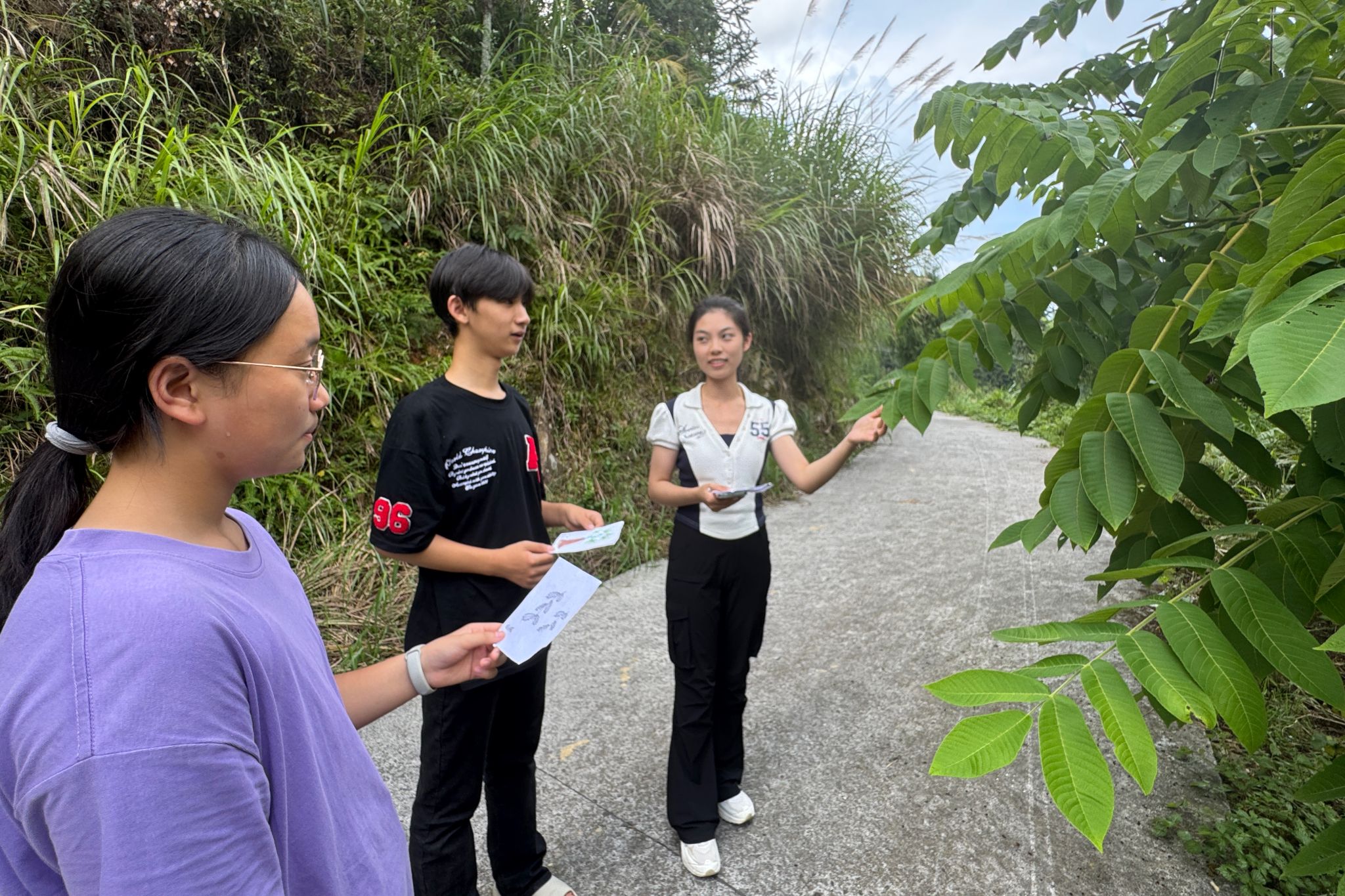 课程开始前,授课人根据本地植物种类,手绘多张识别卡片,作为学生野外辨认植物的参考。课程过程中,实践团带领学生沿村边山道行进,引导其根据卡片内容在林下、路旁等区域观察、寻找植物样本。在确认目标植物后,师生集中观察实物,通过实物与卡片对照,识别其名称、叶形、花序等基本特征,并讲解植物的生长环境及常见用途。教学过程强调观察与实地体验相结合,帮助学生建立基础植物分类认知。