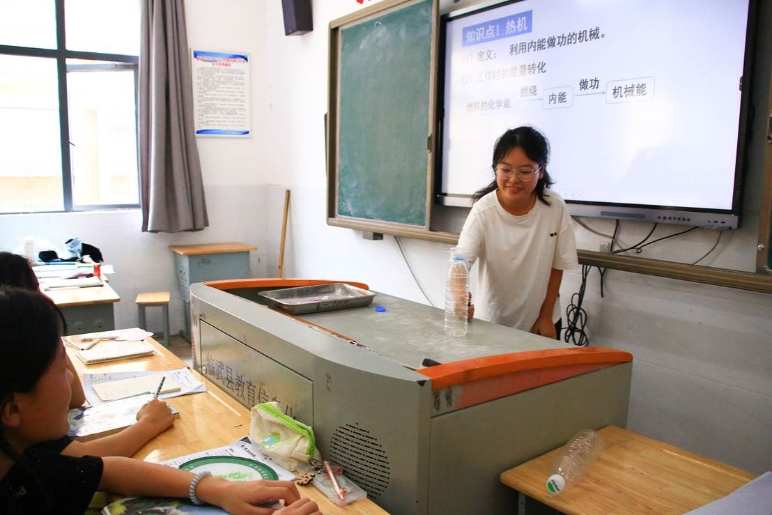 此次课程是实践队科普支教系列活动之一。主讲人准备了塑料瓶、玻璃管、酒精及点火器等简易实验器材。在演示环节中,主讲人先向密封装置内缓慢打气,随着气压逐渐升高,瓶塞瞬间弹出,借此阐释内燃机四冲程中的压缩冲程。随后,在可控状态下,他们用点火器引燃装置内的酒精燃料,燃料燃烧产生的能量推动模拟活塞运动,直观展示了做功冲程的原理。完成关键步骤演示后,主讲人着重讲解安全操作要点,如保持合适距离、规范使用点火器等。多名学生应主讲人邀请上台,亲身体验实验趣味。学生在主讲人指导下操作器材,观察实验现象,进一步加深了学生对内燃机四冲程基本概念的理解。整个过程严谨有序,兼具知识性与趣味性。