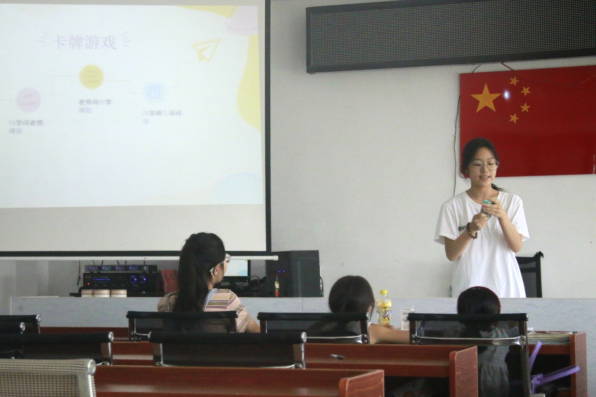 主讲人为进一步加深孩子们对人际关系的理解,开展了卡牌游戏。主讲人说明“人际关系提升卡牌”游戏规则,学生分小组利用卡牌进行游戏。小组代表上台展示卡牌内容并回答卡牌上的问题,在活跃的氛围中,同学们思考日常生活中如何更好地与他人相处,交流讨论人际关系的分类。