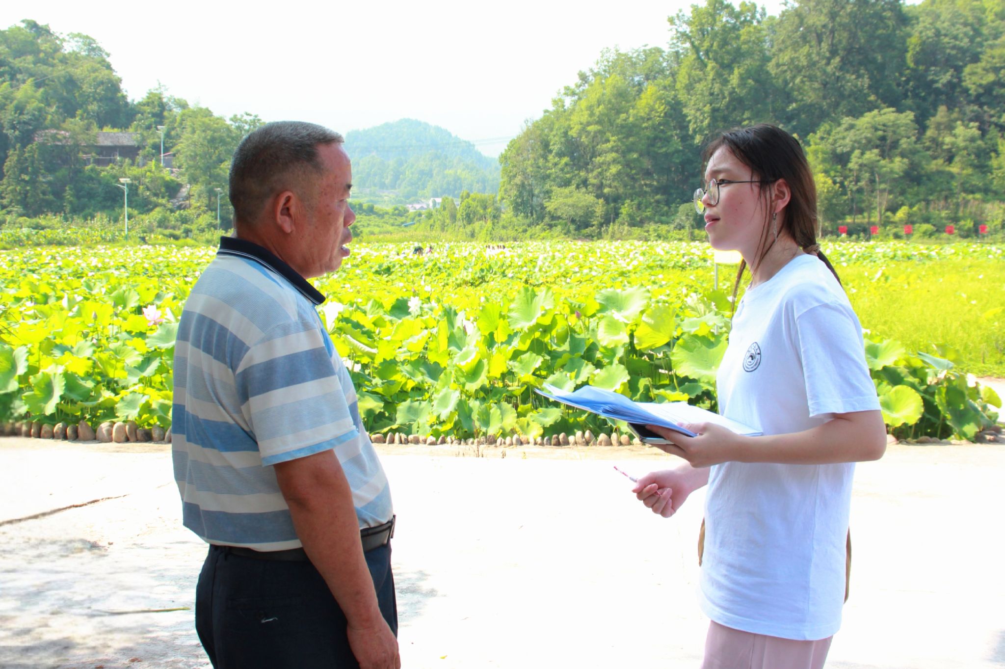 实践团成员在岩板铺村村干部的带领下,对蔡家湾荷塘及周边区域进行实地考察,重点了解莲藕种植与水果种植产业发展情况。通过与村民面对面交流,实践团获悉当地农产品存在销售渠道不畅、销售模式单一、缺乏品牌建设等问题。在人物访谈环节,实践团成员采访了前来观赏荷花的游客和本地村民,他们表示岩板铺村风景秀美,民风淳朴,建议完善旅游基础设施并加强网络宣传。