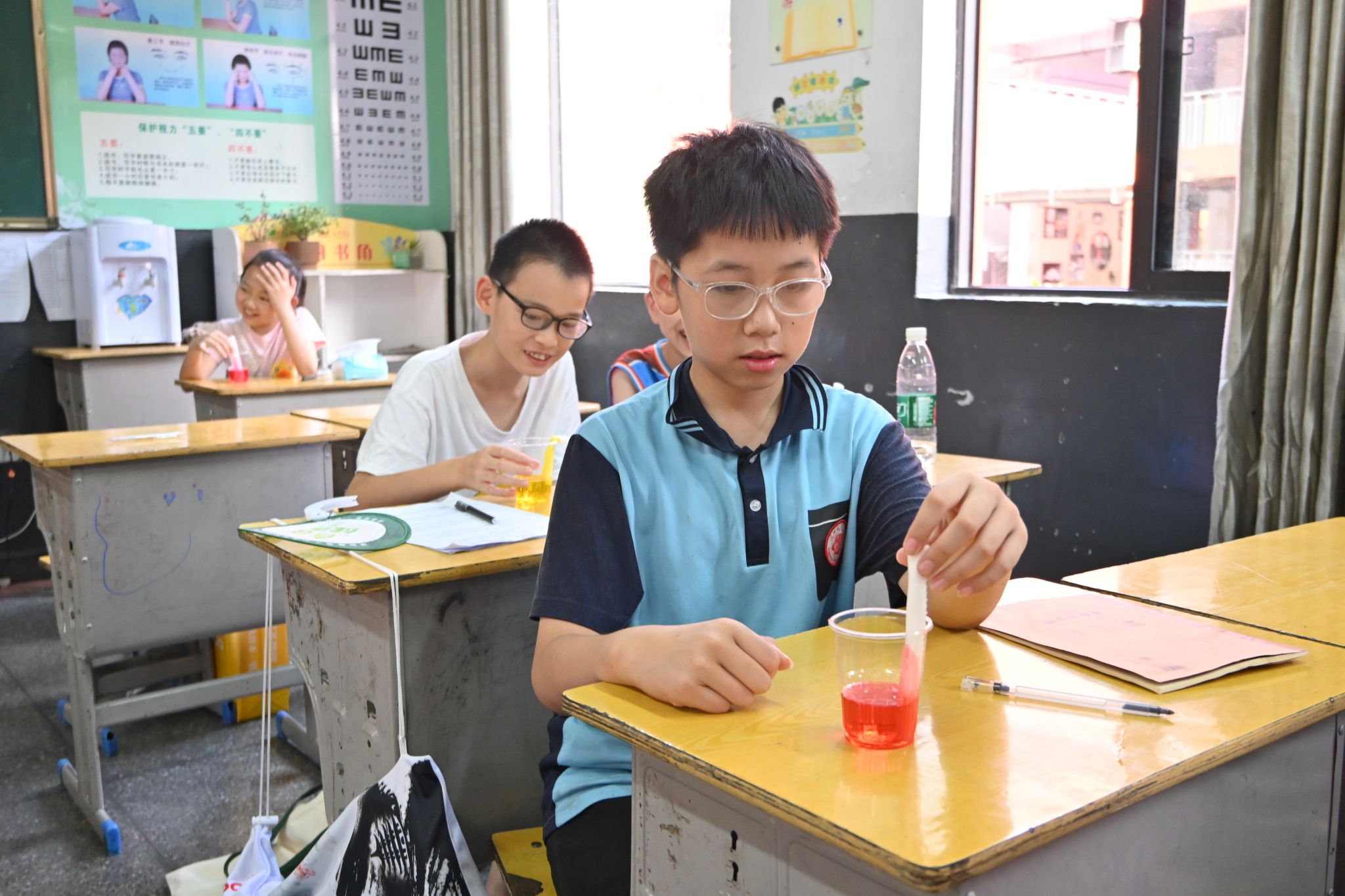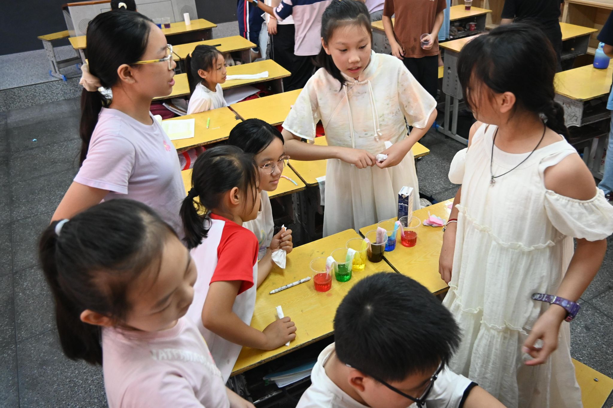 实践团成员以毛皮摩擦塑料棒的静电实验作为课堂导入,演示用毛皮摩擦塑料棒后靠近纸屑,纸屑被吸附的现象,使学生直观感受静电的存在。随后开展的彩虹桥实验中,学生在实践团成员的指导下将不同颜色的水倒入透明容器,再将纸巾两端分别放入不同颜色的水中。随着时间推移,学生可以观察到纸巾上颜色的变化过程,实践团成员同步讲解其中涉及的液体表面张力和毛细作用原理。有学生表示,纸巾上的颜色逐渐连接,形成了类似彩色桥梁的形态。