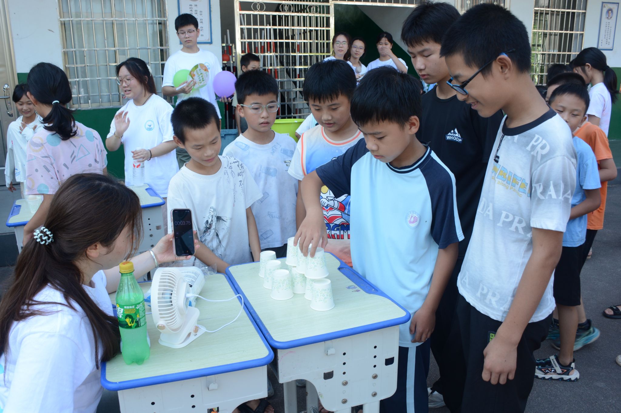 学生参与“纸杯金字塔”游戏