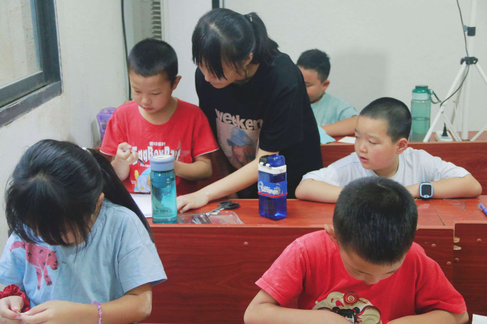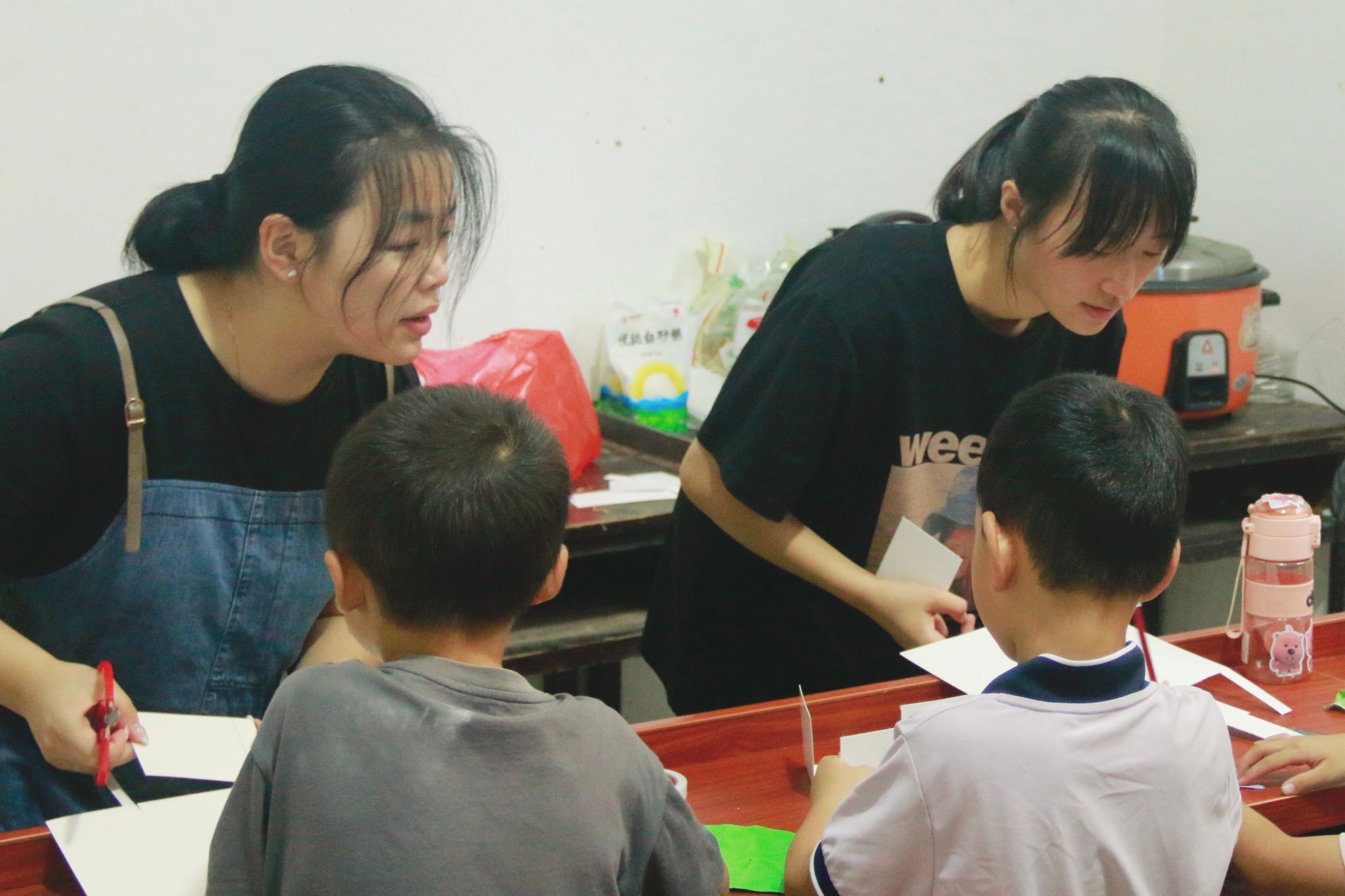 主讲人下台指导学生制作简易立体书