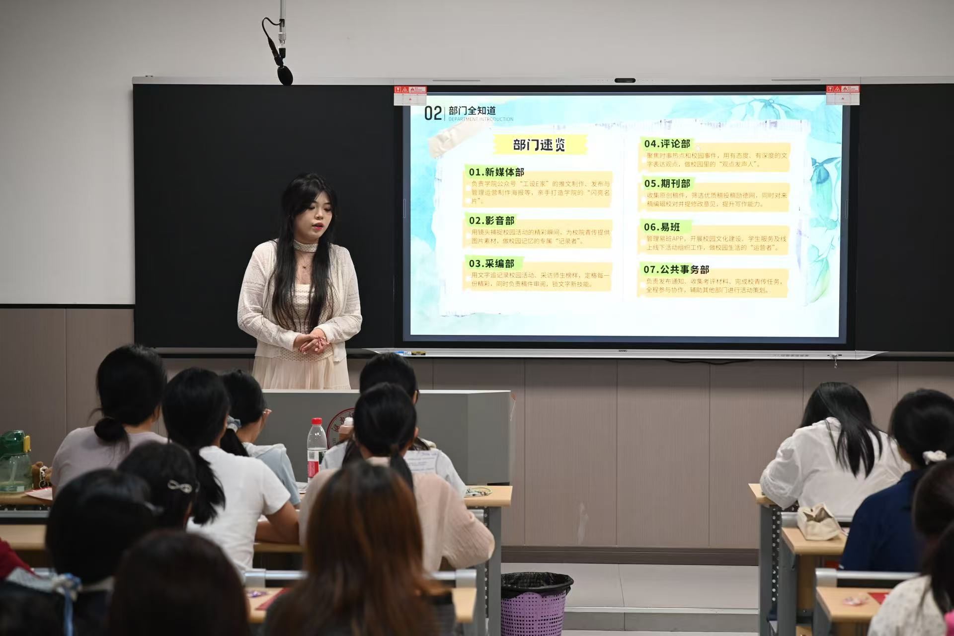 四大团学组织负责人精心准备了宣讲PPT和宣传视频,方便25级新生更直观地了解各个部门,并鼓励新生根据自身能力及兴趣进行选择。宣讲过程中,各系统负责人依次上台宣讲,通过展示活动照片和放映宣传视频的方式对各部门负责人、内容特色、工作成果进行介绍,并结合自身经历分享了从事学生工作为自己带来的改变与提升。各部门阐述了招新要求,并针对新生们提出的问题进行解答。