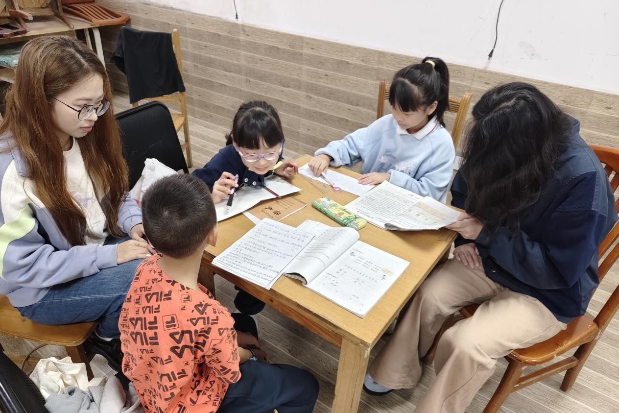 活动过程中,志愿者们通过趣味问答的方式了解学生共性问题,并针对每位学生周末学习任务的进度与难点,采取集中讲解与分组辅导相结合的形式对学生进行思路引导和方法点拨。