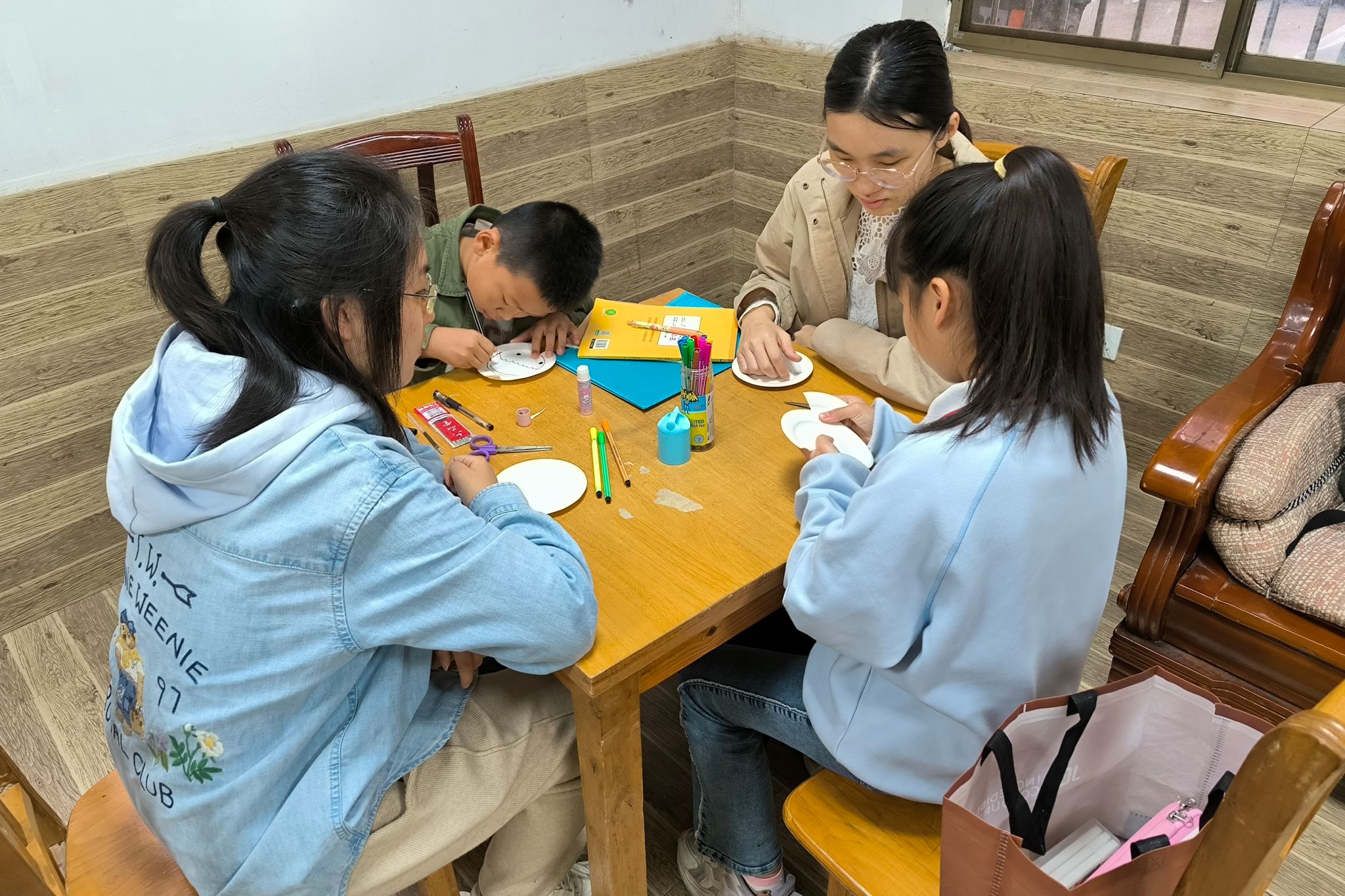 在互动环节,志愿者鼓励孩子们自主选择颜色与装饰方式,引导他们独立完成手工作品。孩子们积极参与,互相交流制作技巧,探索纸盘多种创作可能。在折叠与拼贴过程中,他们不仅体验到手工制作的乐趣,也展现出丰富的想象力和完成作品的成就感。