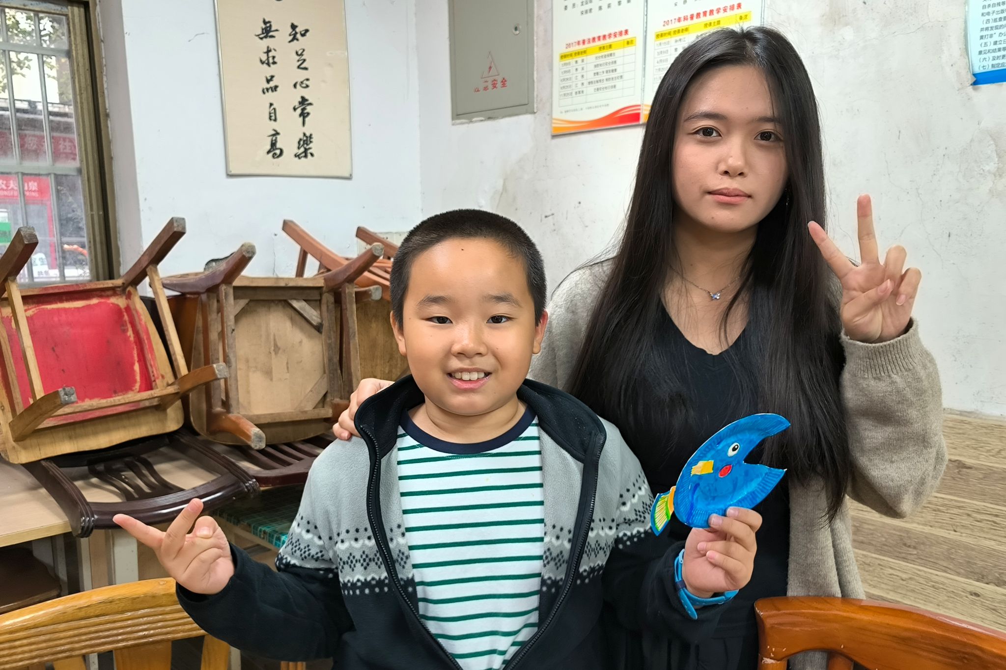 志愿者与孩子共同展示作品