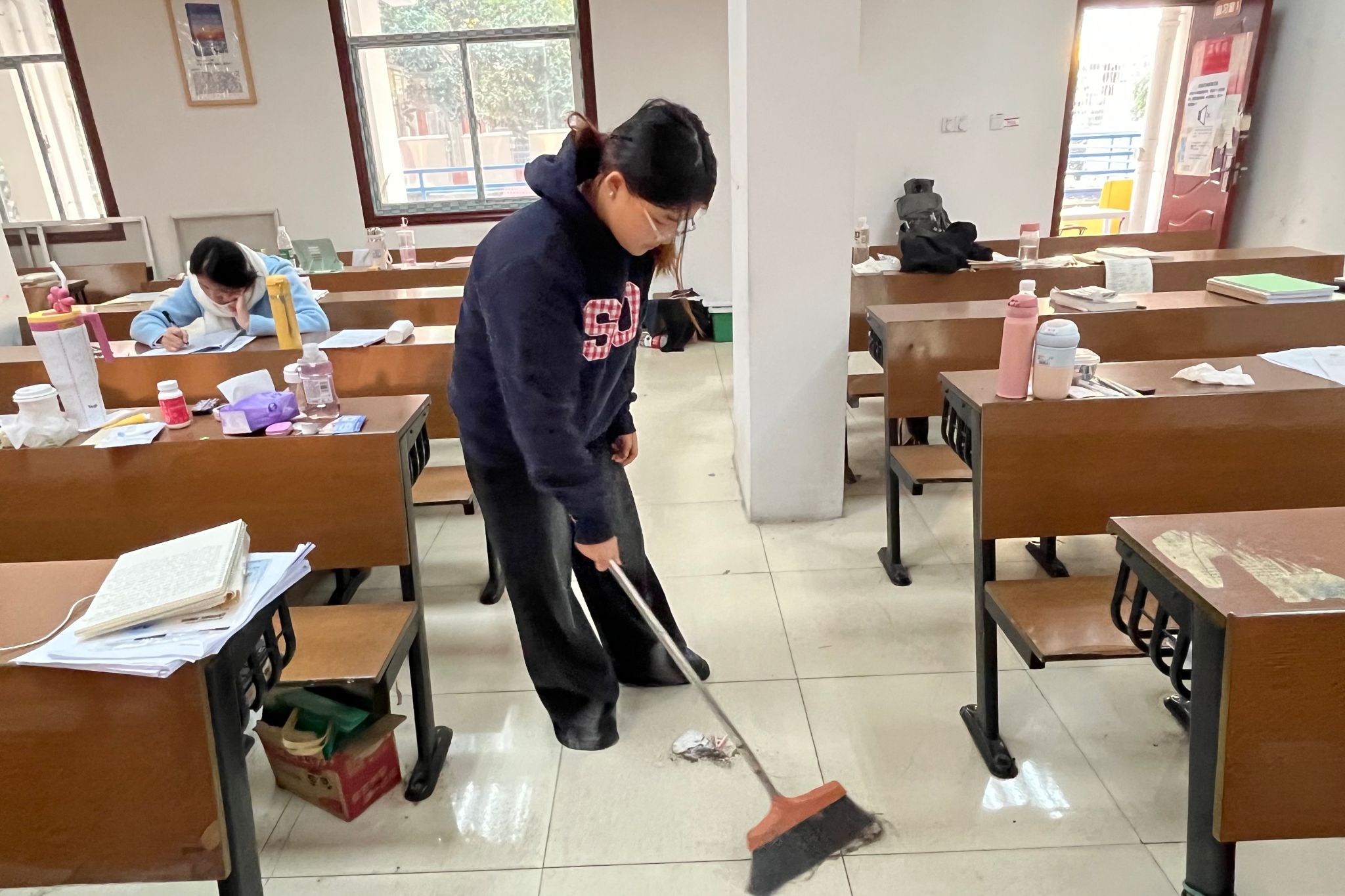 (通讯员 全淼 姜雨双)10月28日中午,为优化自习室学习环境,提升服务精准度,太阳成集团tyc天马学生公寓园区团工委学生分会组织志愿者对天马学生公寓23-28栋两间公共自习室开展专项清洁行动,同步进行自习体验调查,与同学深入交流,推动打造舒适整洁的自习环境。