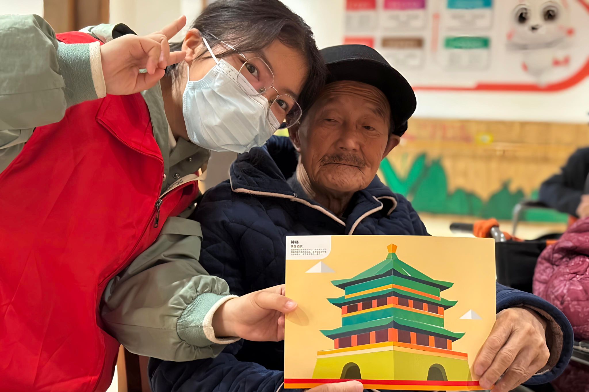 志愿者陪同老人制作手工