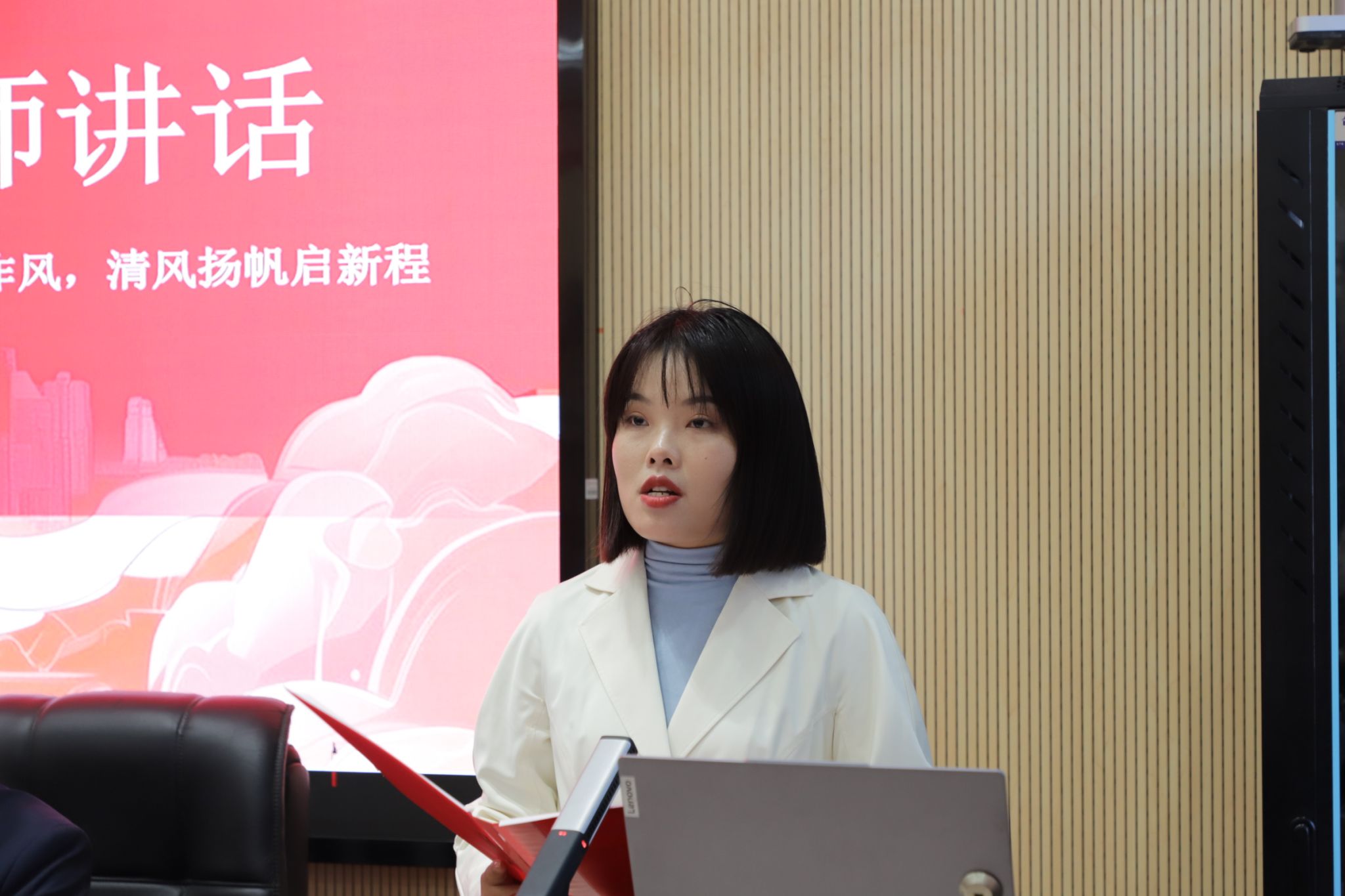 活动现场,吴晴围绕新时代青年作风建设发表讲话。她表示,本次论坛精准聚焦青年纪律规矩培育,提升对作风建设的认知能力与践行能力。活动设置“清风微剧场”、“红色知识问答”等特色栏目,以创新形式推动中央八项精神入脑入心。四位主讲人结合自身科研实践与自身感悟,阐释新时代青年践行中央八项规定精神的实践路径,向同学们全面解读中央八项规定精神在青年学子成长成才中的实践意义。郭梁对此次活动进行点评,肯定同学们的思考与实践。他认为青年需以中央八项规定精神为指引,紧扣科研诚信和作风建设,践行青春担当。