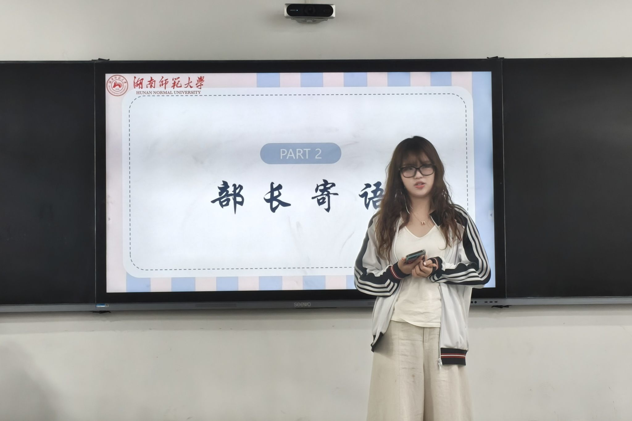 会议伊始,主席团成员围绕本学期工作目标与组织建设要求进行发言,明确了各部门职责分工与工作重点。在部门展示环节,各部门负责人依次介绍部门职能与工作特色,新进干事通过自我介绍展现个人特长与工作设想。文体部干事带来才艺表演,健服部干事合唱歌曲《改变自己》,展现了部门特色与团队活力。