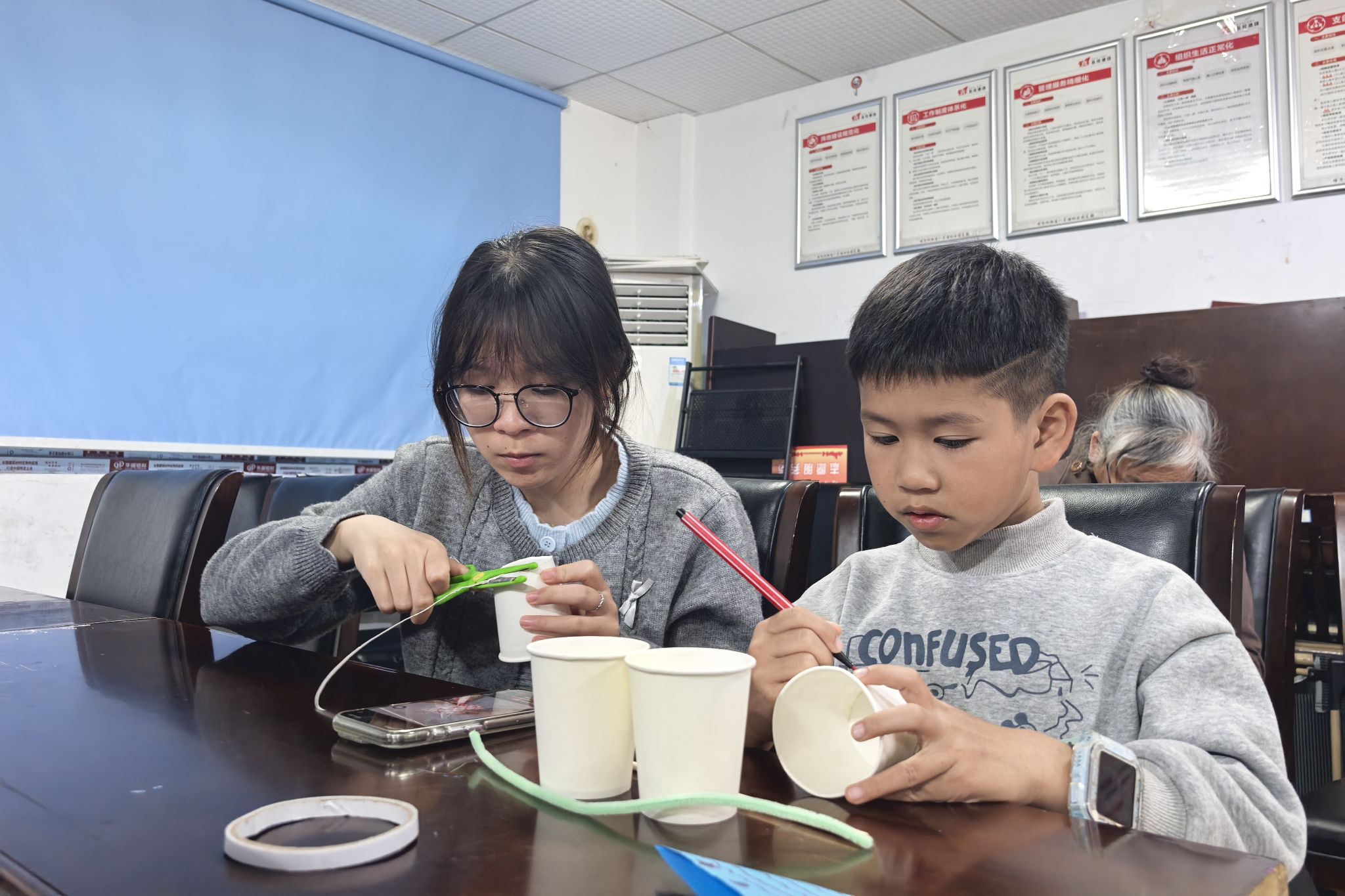 志愿者和小朋友共同制作鱼灯