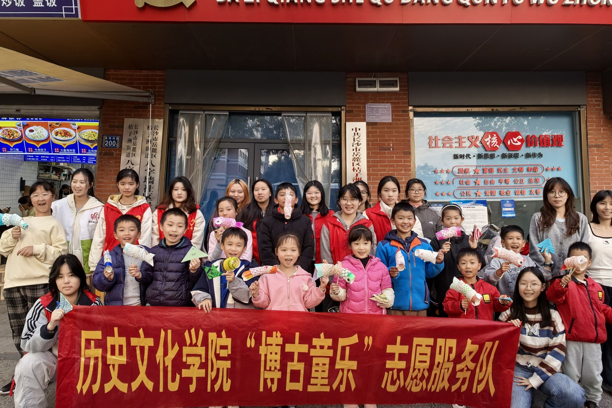活动在全体合影中结束。此次志愿服务通过"讲、问、做、展"的模式,展现了高校与社区共建的文化传承路径,增强了青少年对非遗文化的认知。