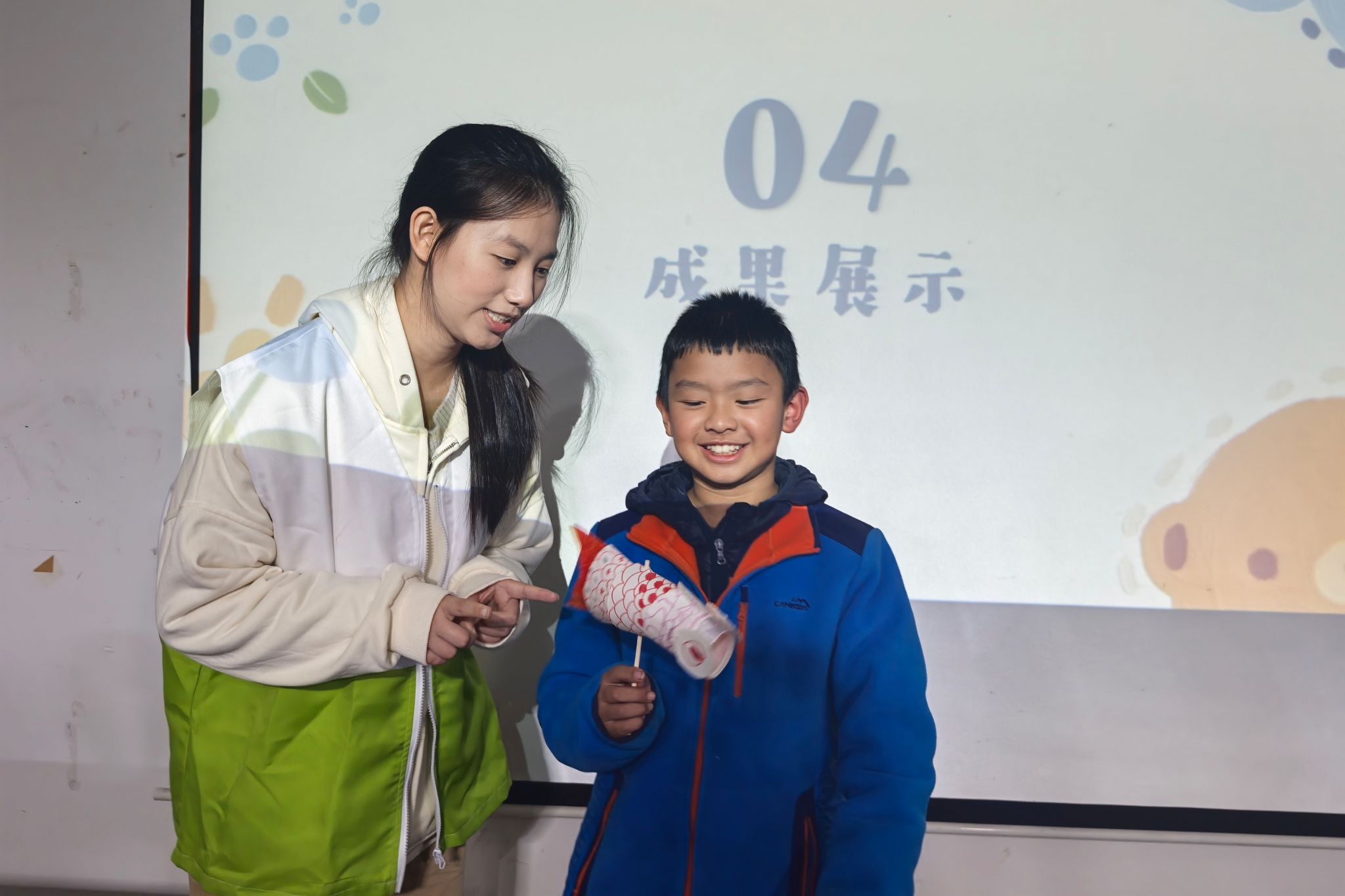 互动环节中,小朋友们通过观察鱼灯的竹编骨架、彩绘纹样与舞动阵型,领会"鱼跃龙门"等寓意。主讲人围绕全运会设置文化拓展问答,让小朋友们探讨鱼灯在体育盛会中的创新应用,展现了传统技艺在现代社会中的多元发展。在手工环节,小朋友们在志愿者的协助下,将湖湘纹样绘制于纸杯表面,创作出兼具传统韵味与童趣特色的鱼灯。制作完成后,孩子们依次上台展示并分享设计理念,在实践中加深对非遗鱼灯与湖湘文化的理解。