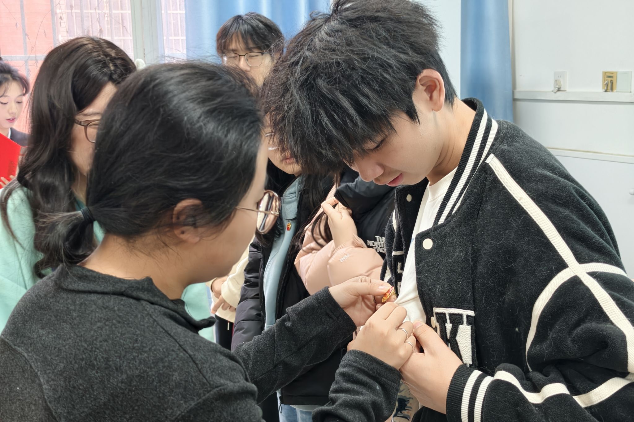 老团员为新团员佩戴团徽
