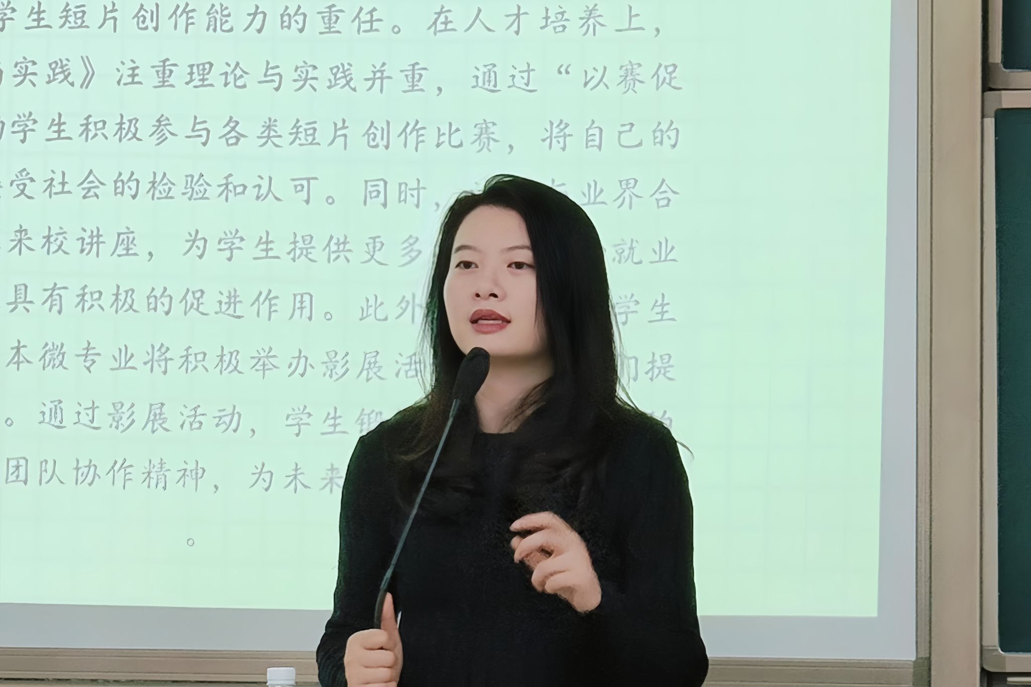 主持人介绍流程后,培训正式开始。李婕以“无目的的合目的性”为切入点,结合创办三江影视的实践经验,阐释艺术创作中“不为功利做,却因诚意成”的理念。她表示创作应坚守艺术初心,同时具备市场意识与跨界思维,实现艺术价值与社会需求的有效对接。通过分享指导学生获奖经历,她还鼓励同学们勇于尝试与实践,不断提升专业能力与团队协作水平。