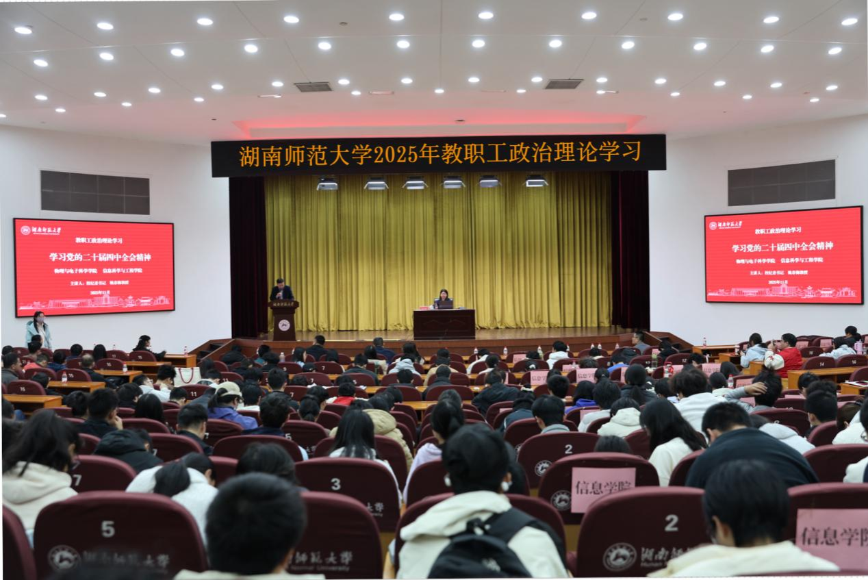 (通讯员 方诗语)为推动党的二十届四中全会精神落地高校教育一线,充分发挥高校教师育人引领作用,11月27日,信息科学与工程学院(以下简称“信息院”)与物理与电子科学学院(以下简称“物电院”)在国际学术报告厅开展教职工理论学习。此次学习以“在接续奋斗中谱写中国式现代化新篇章——学习党的二十届四中全会精神”为主题,由校纪委书记姚春梅主讲。