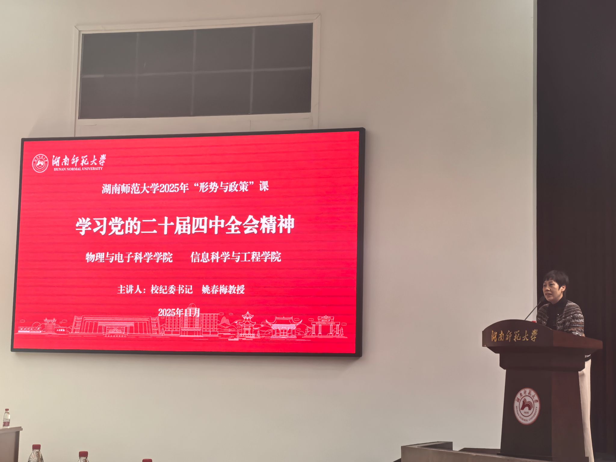(通讯员 方诗语)为引导青年学子领会党的二十届四中全会精神,把握国家发展战略,将个人成长融入中国式现代化建设,11月27日,信息科学与工程学院(以下简称“信息院”)与物理与电子科学学院(以下简称“物电院”)在国际学术报告厅开展以“在接续奋斗中谱写中国式现代化新篇章——学习党的二十届四中全会精神”为主题的《形势与政策》课程,此次课程由校纪委书记姚春梅讲授。