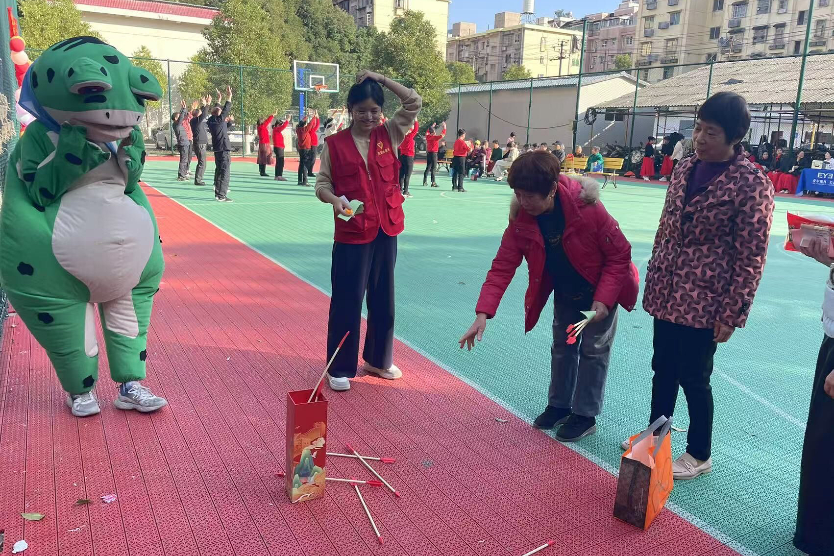 在相关负责人的安排下,志愿者们提前到达现场进行布置整理,在社区篮球场内悬挂红色横幅与彩色气球。身着青蛙造型玩偶服饰的志愿者主动与老人打招呼、陪伴老人并亲密互动,身着红马甲的活动志愿者们协助布置了以“生辰同贺”“福寿安康”为主题的相关装饰,并在活动期间陪同老人们参与投壶游戏。