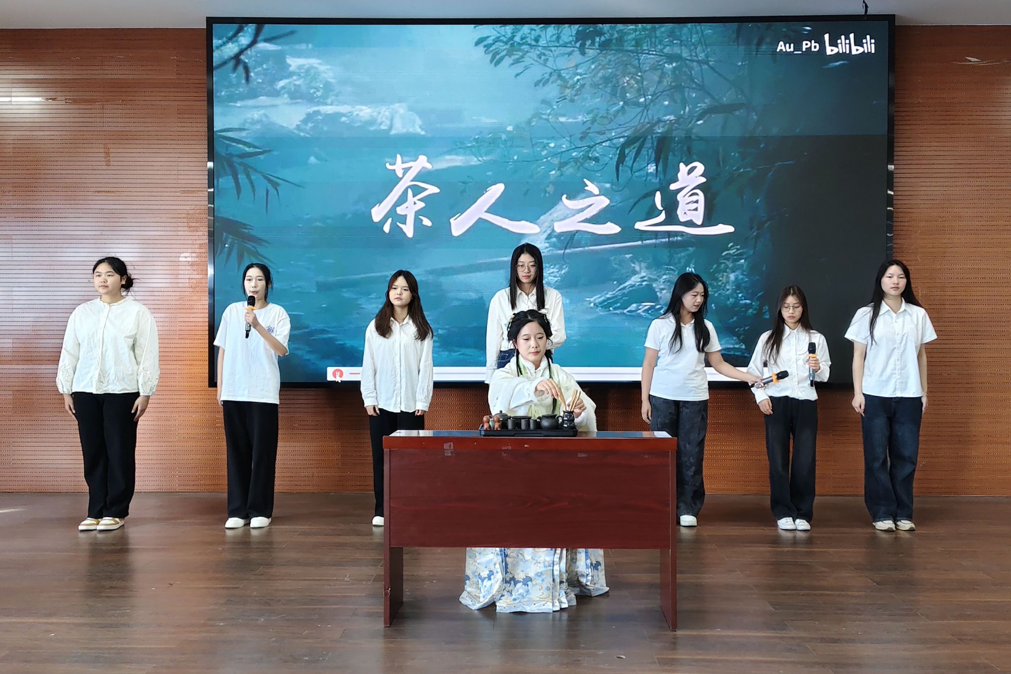 表演环节,由八名社团成员带来节目《一盏茶里的山河与岁月》。活动形式为由一名成员表演茶艺,按照传统方式泡茶,其他七名成员一起诵读历代与茶相关的诗词和文章选段。观众在茶艺与经典朗诵中感受传统茶文化的魅力。