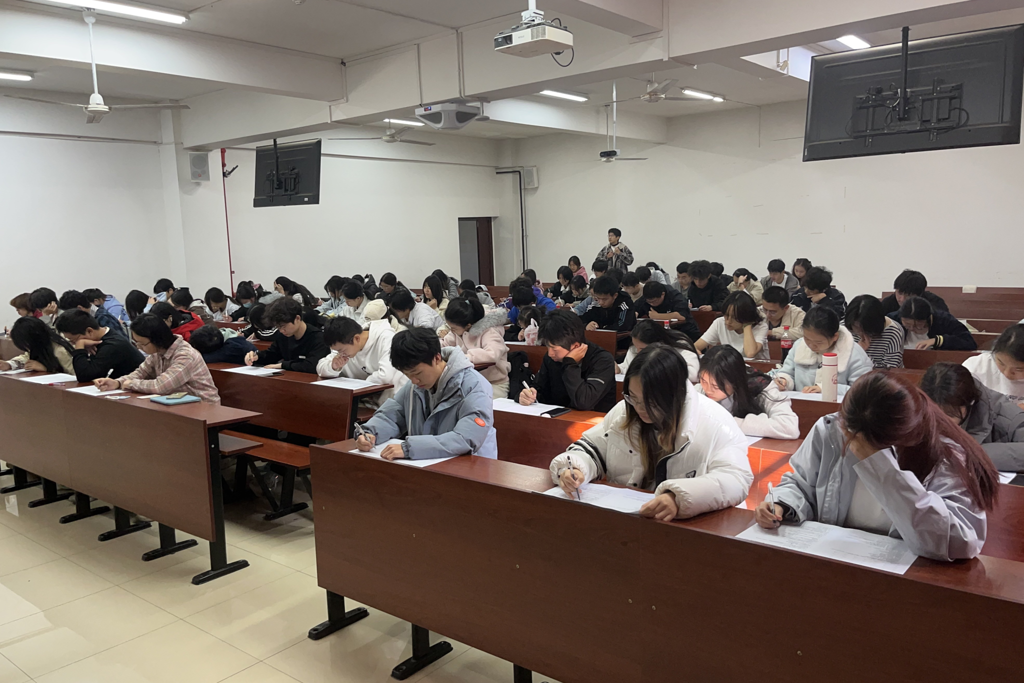 筹备阶段,工作人员提前抵达考场,完成场地布置、核对考生名单与分发试卷工作,并引导到场同学按指定位置就座。试卷分发完毕后,参赛同学迅速开始答题,考场秩序井然。考试期间,工作人员全程巡视监考,在维护考场纪律、关注答题进度的同时,也及时为有需要的同学提供帮助,保障考试公平有序进行。
