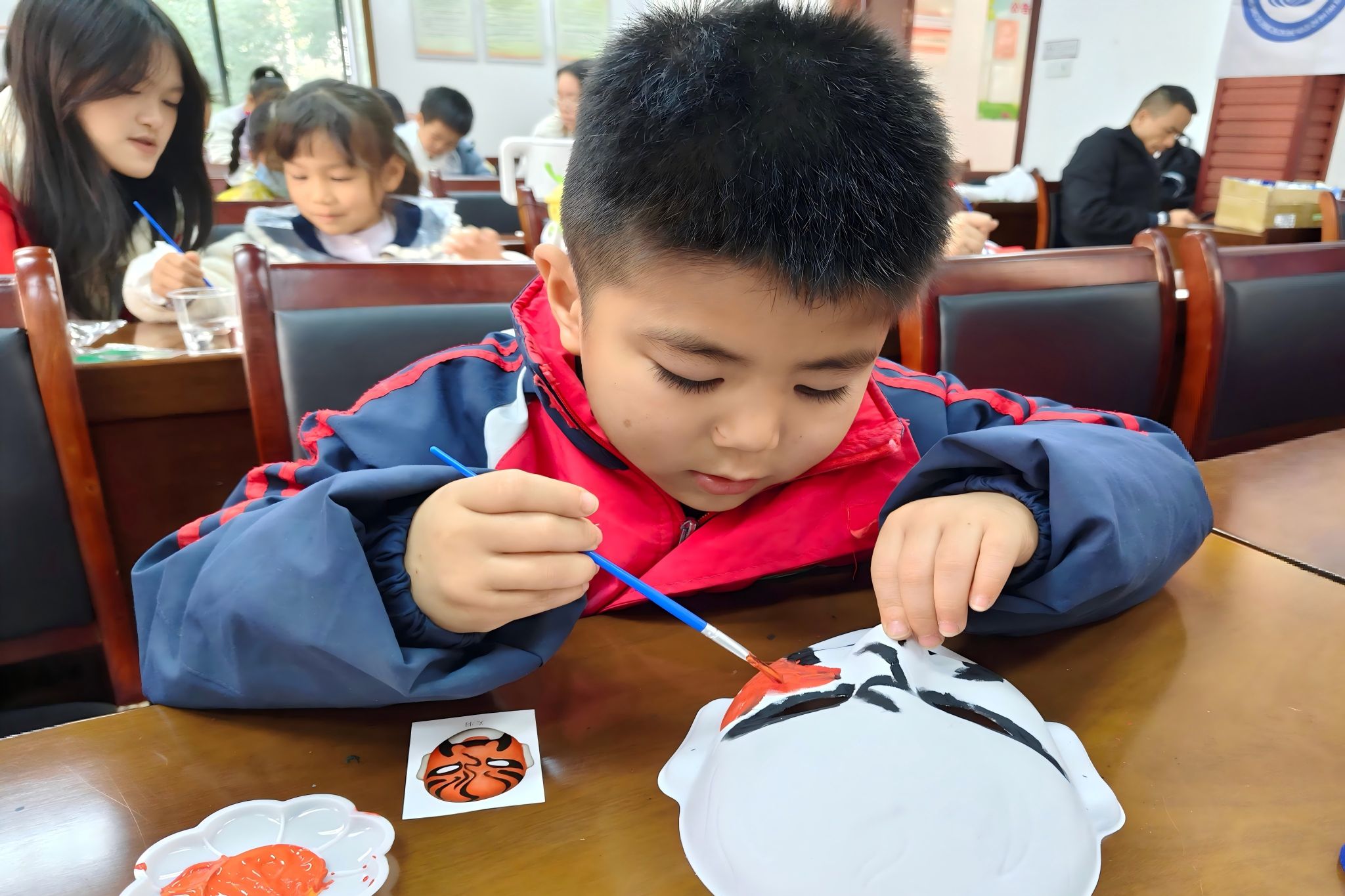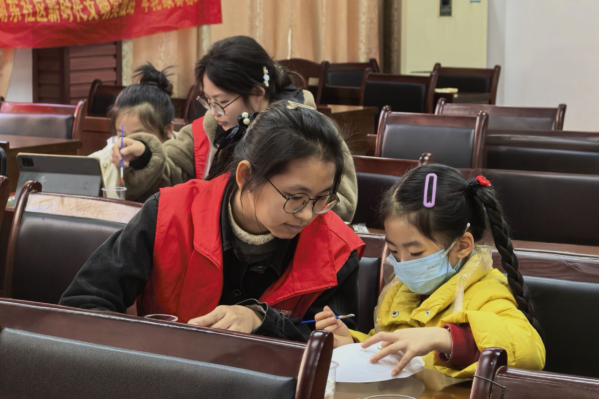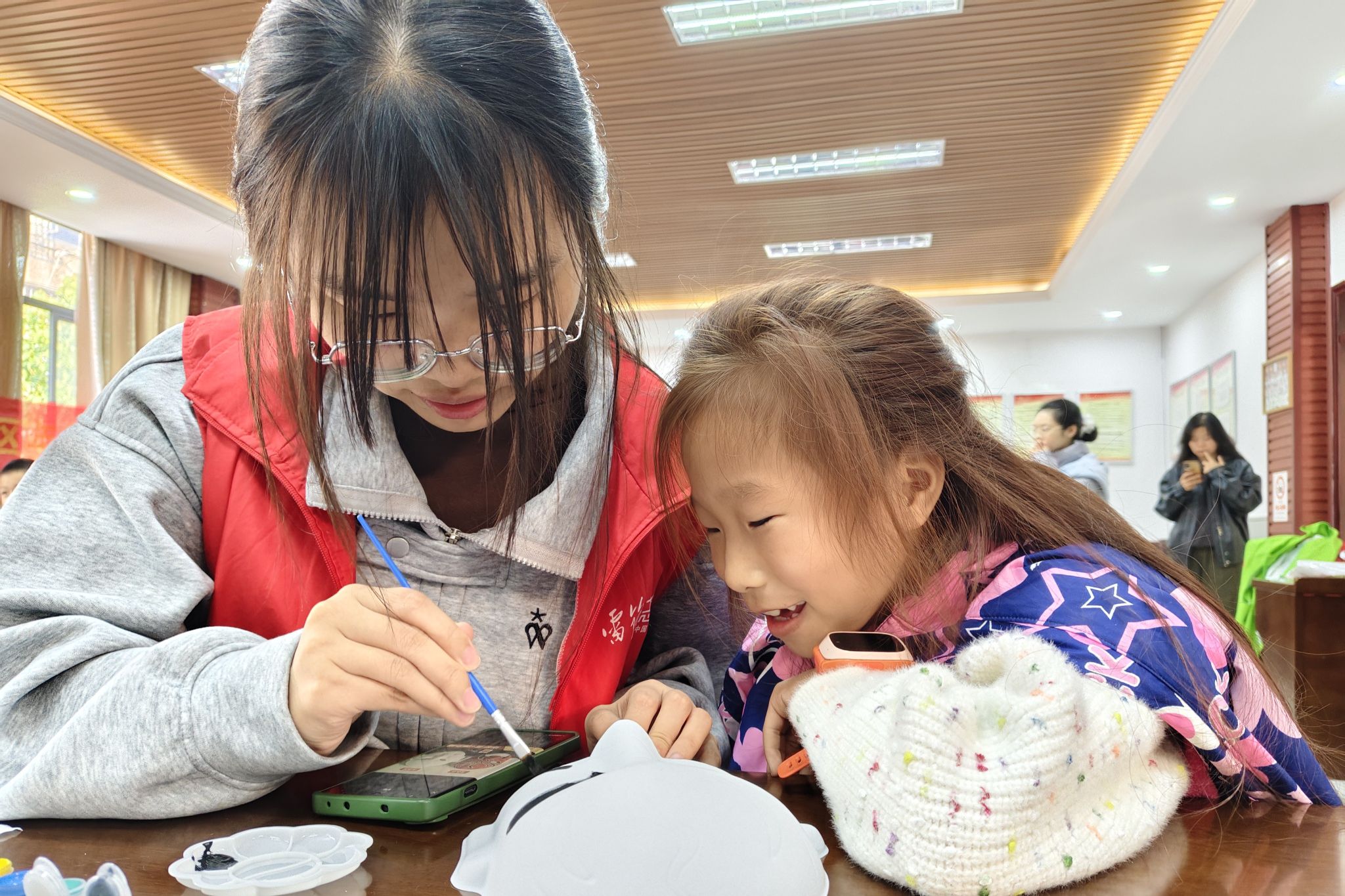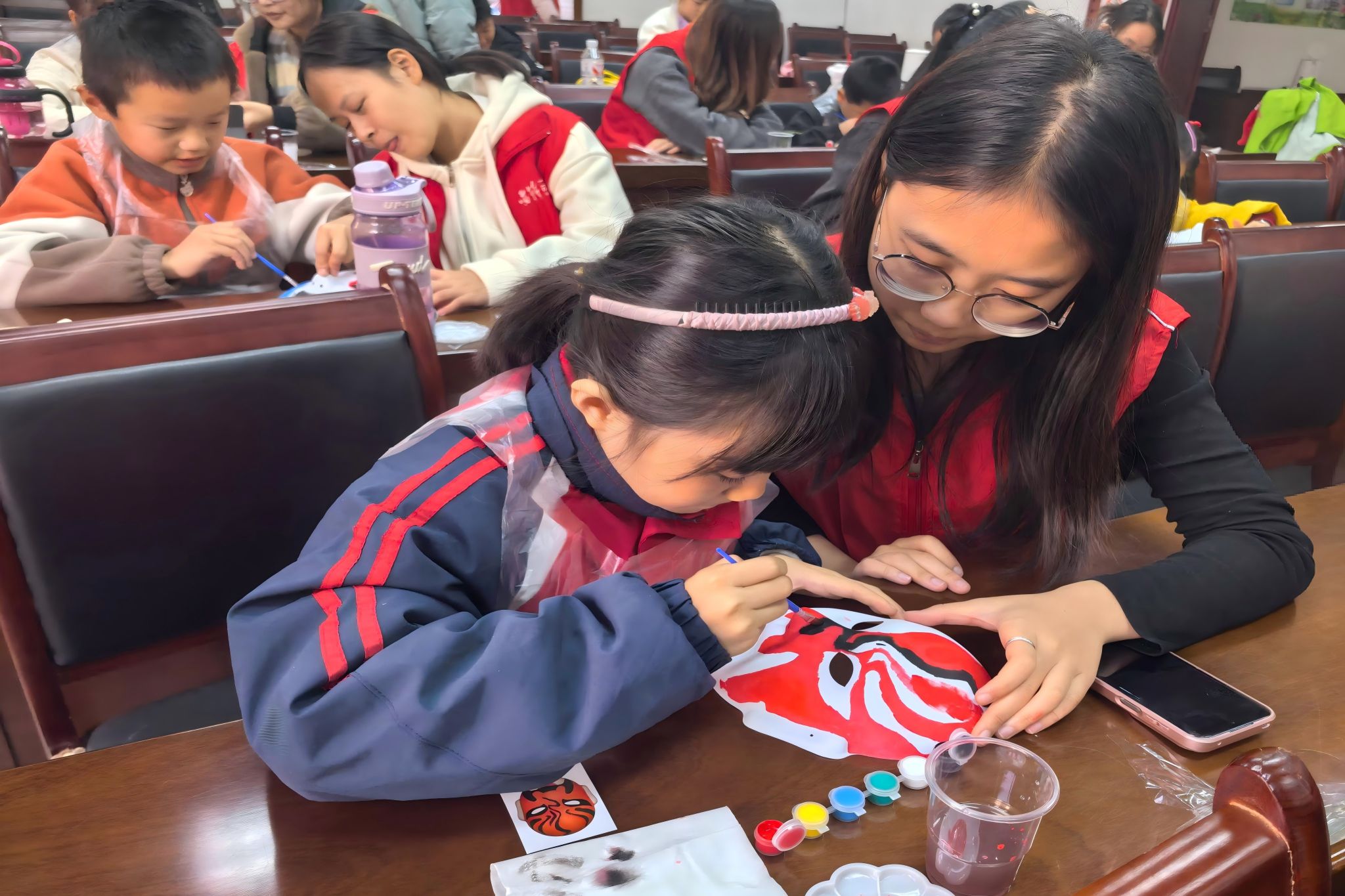 志愿者和小朋友一起合作完成脸谱的上色操作