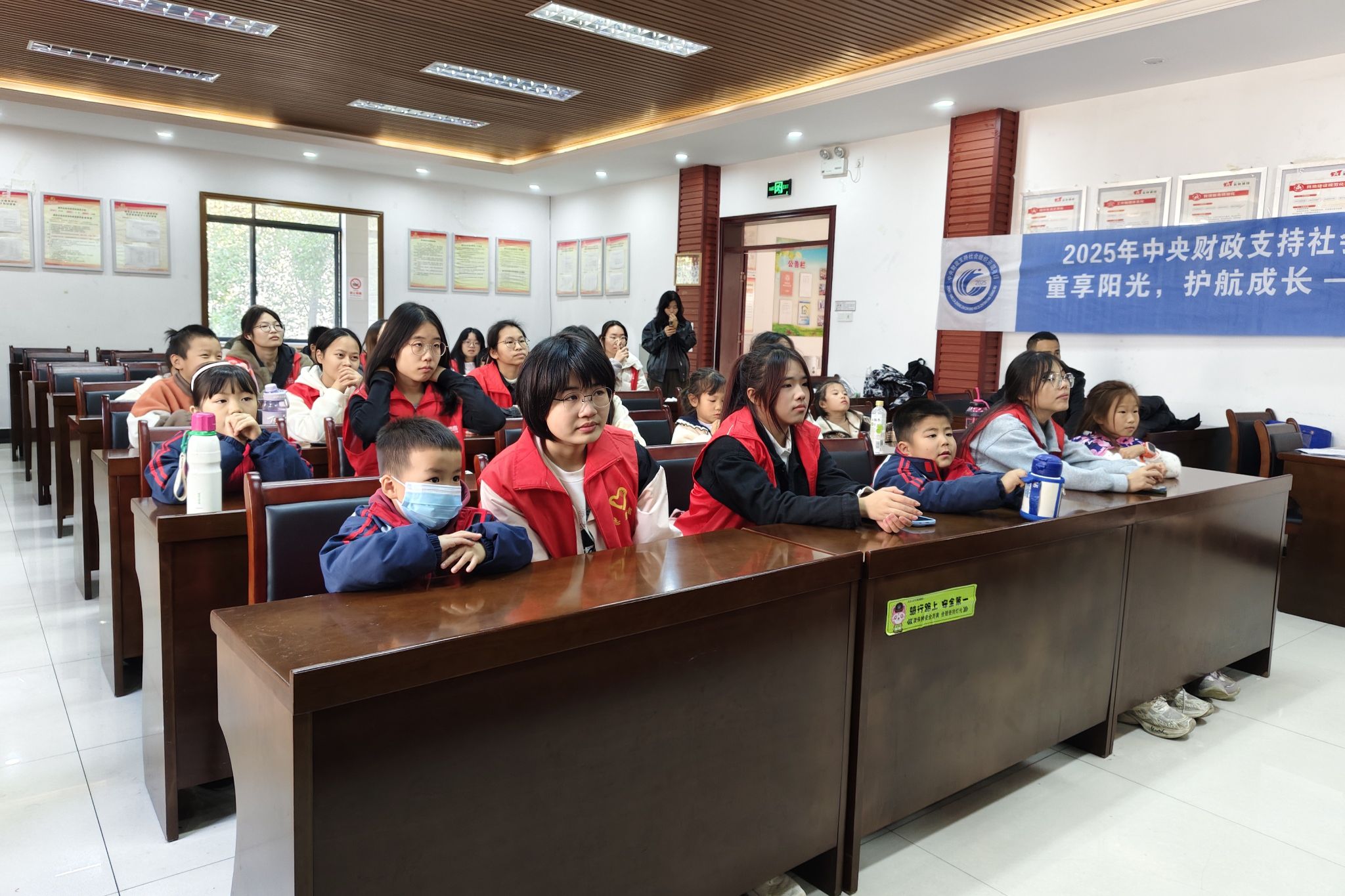 志愿者和小朋友们专心听主讲人进行知识讲解