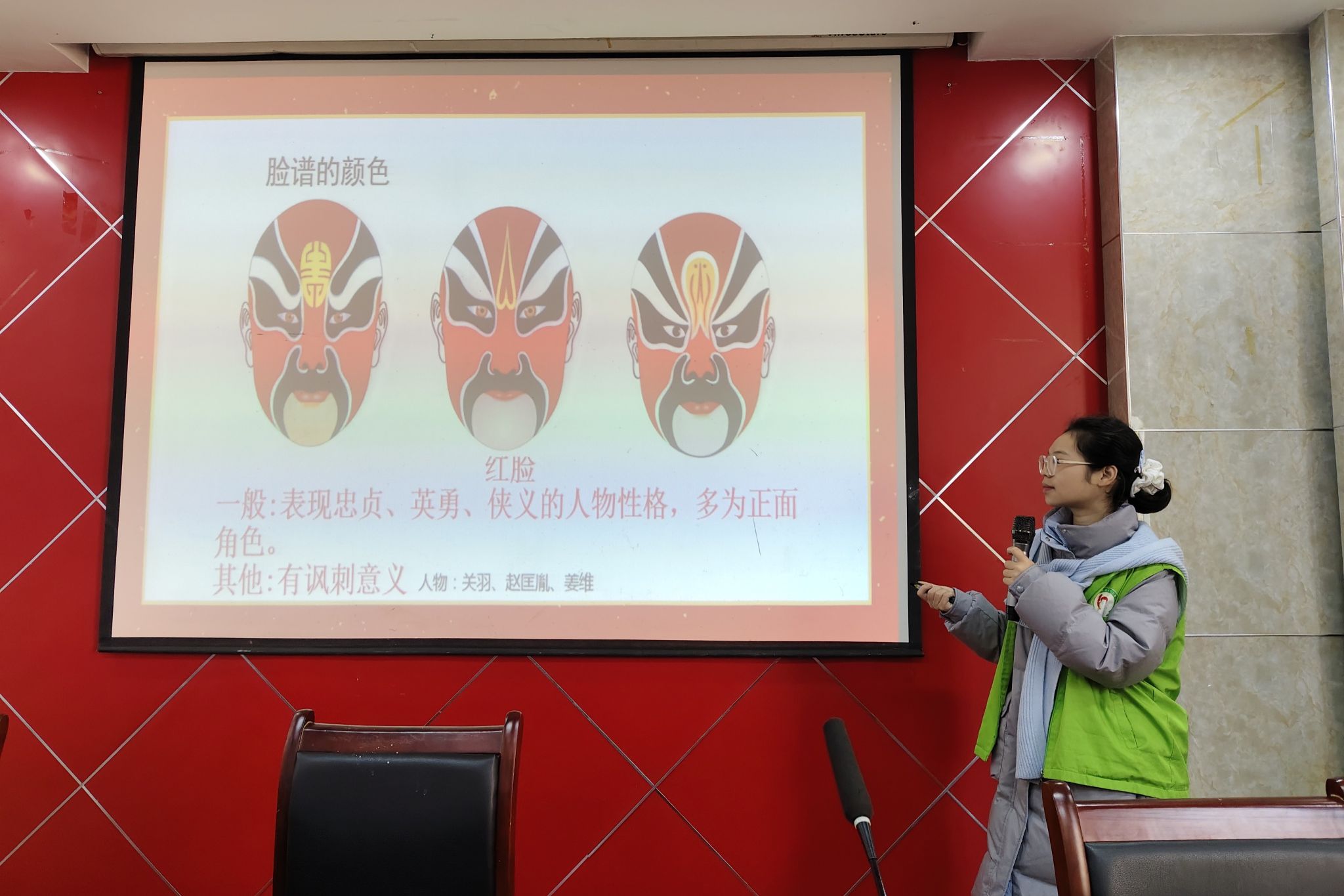 主讲人结合具体图片,介绍脸谱艺术的色彩寓意