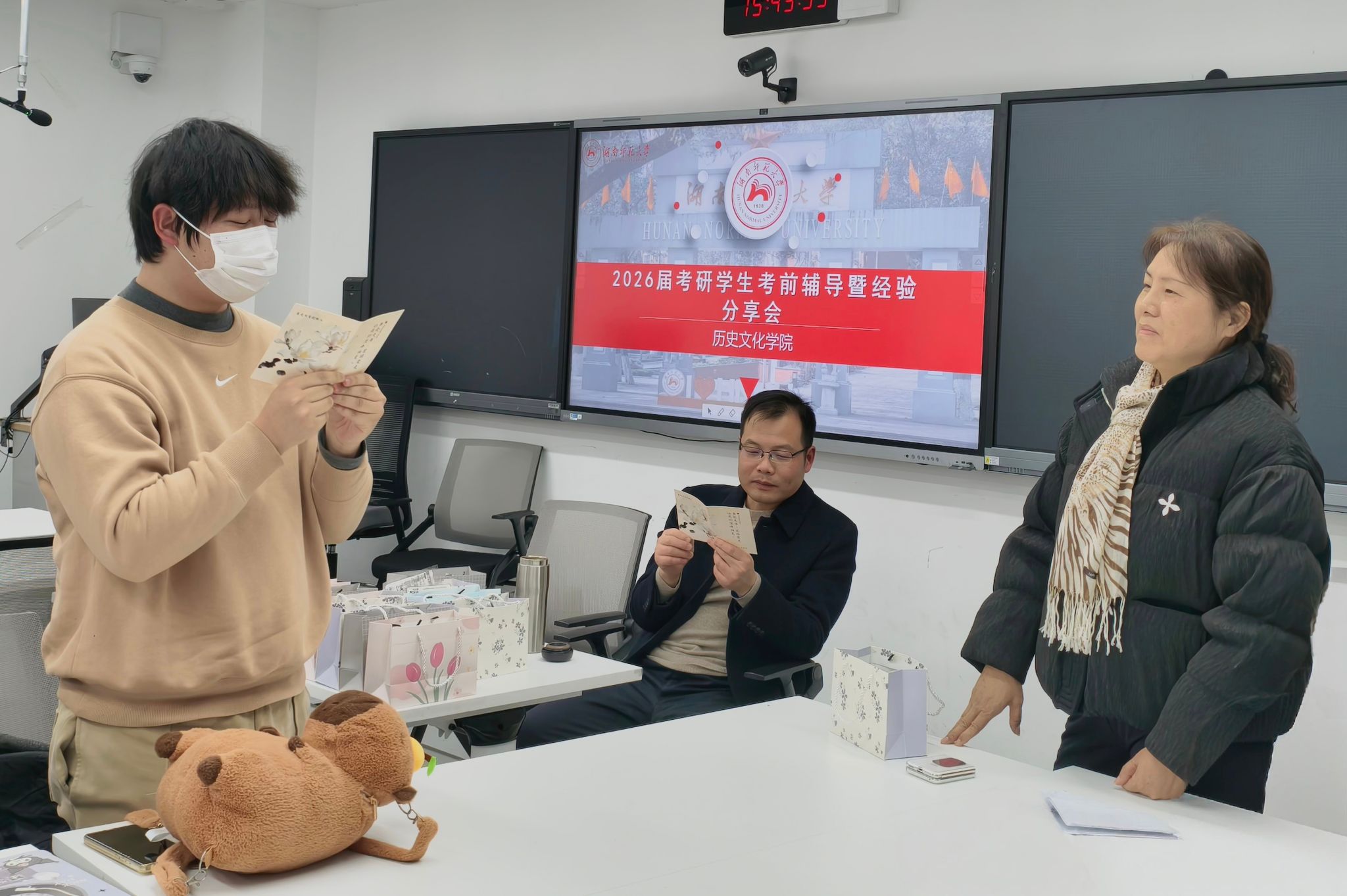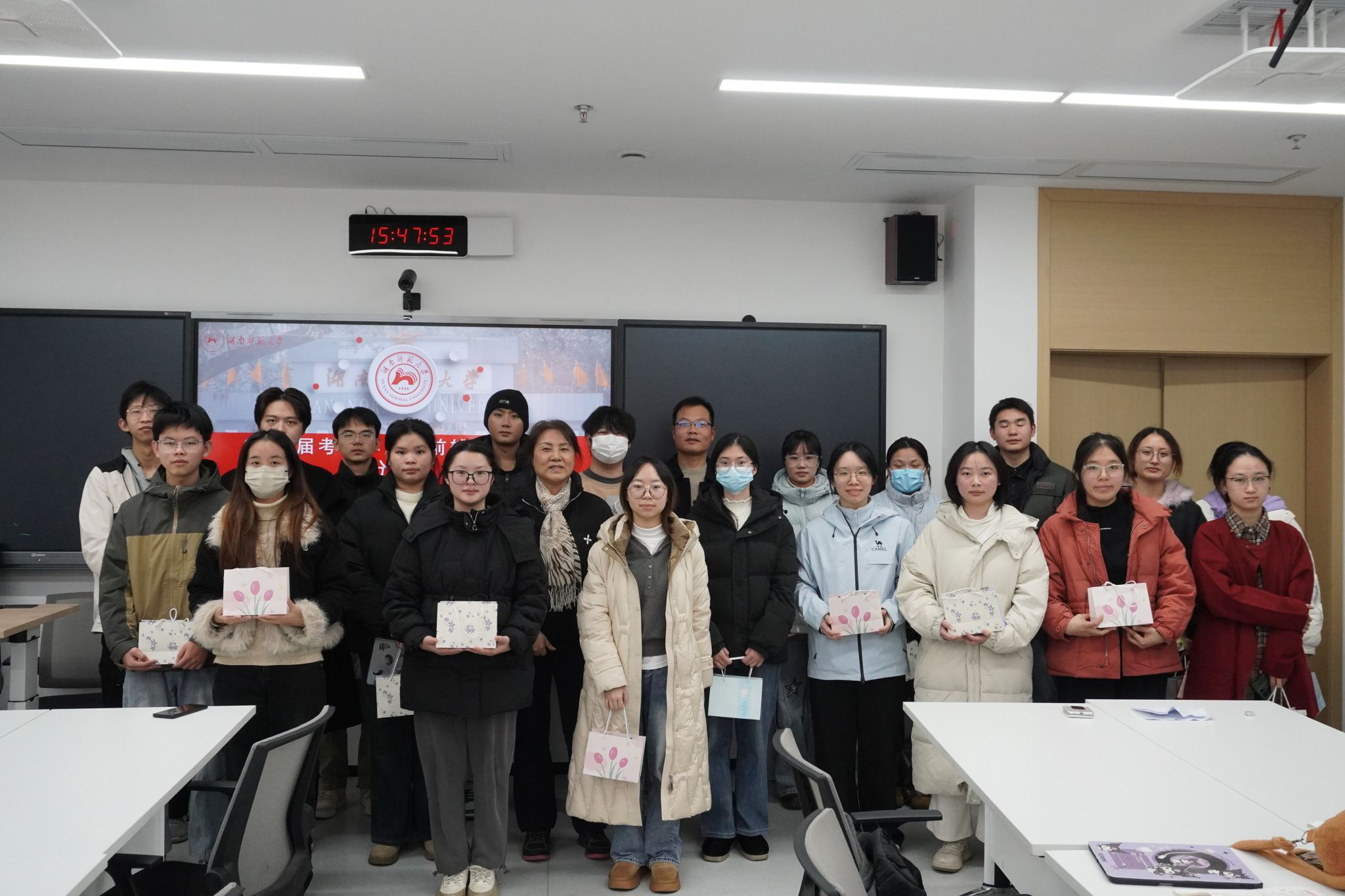 交流结束后,马欣与同学们亲切交谈,鼓励大家坚定信心、科学规划复习与作息,并表示学院将持续做好后勤保障与支持工作,全力为考研学子护航。现场,马欣还为同学们分发了学院准备的“暖心考研礼包”,传递关怀与期许。