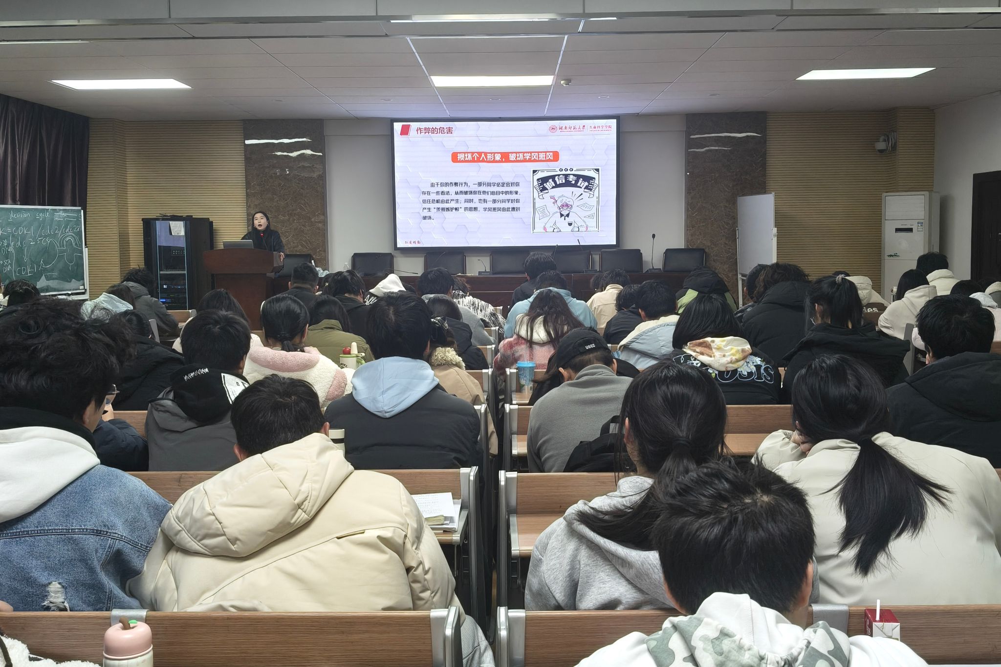 会议围绕问题分析、考前诚信教育和假期安全教育三个方面展开,为学期末各项工作有序推进明确方向。以2021级和2022级优秀学子为引,林鑫瑶分析2025级本科生学习、生活上出现的问题。她表示同学们在学习上应该端正学习态度、目光长远、合理分配时间,学会主动与老师沟通,在生活上合理安排作息、注意寝室用电安全,并做好生活与学习的平衡。随后,林鑫瑶分析《考核违规处理办法》,表明作弊等违纪行为的后果,提醒同学们诚信应考。此外,从林鑫瑶的讲述中,同学们了解到交通安全、网络安全等各类安全注意事项,悉知了“长沙城区10月后禁止燃放烟花爆竹”等规章制度。