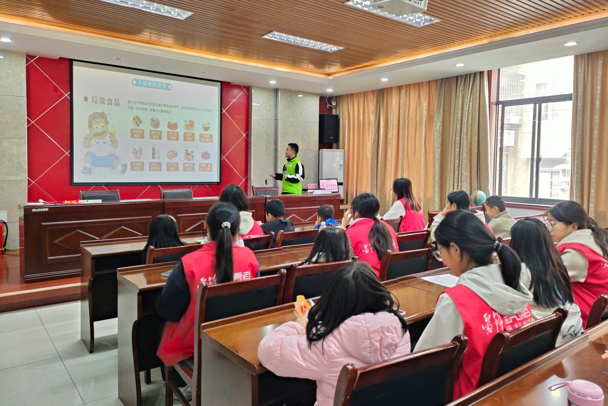 志愿者和小朋友们认真听主讲人进行食品安全宣讲