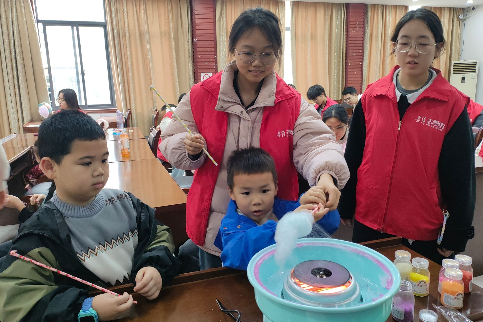 小朋友对做棉花糖机感到好奇,志愿者在一旁讲解