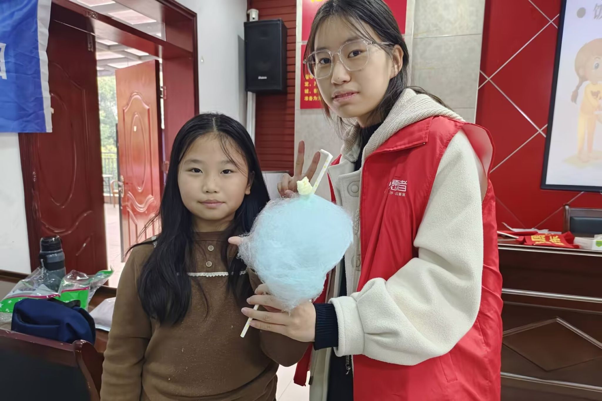 志愿者和小朋友对他们制作的棉花糖进行展示