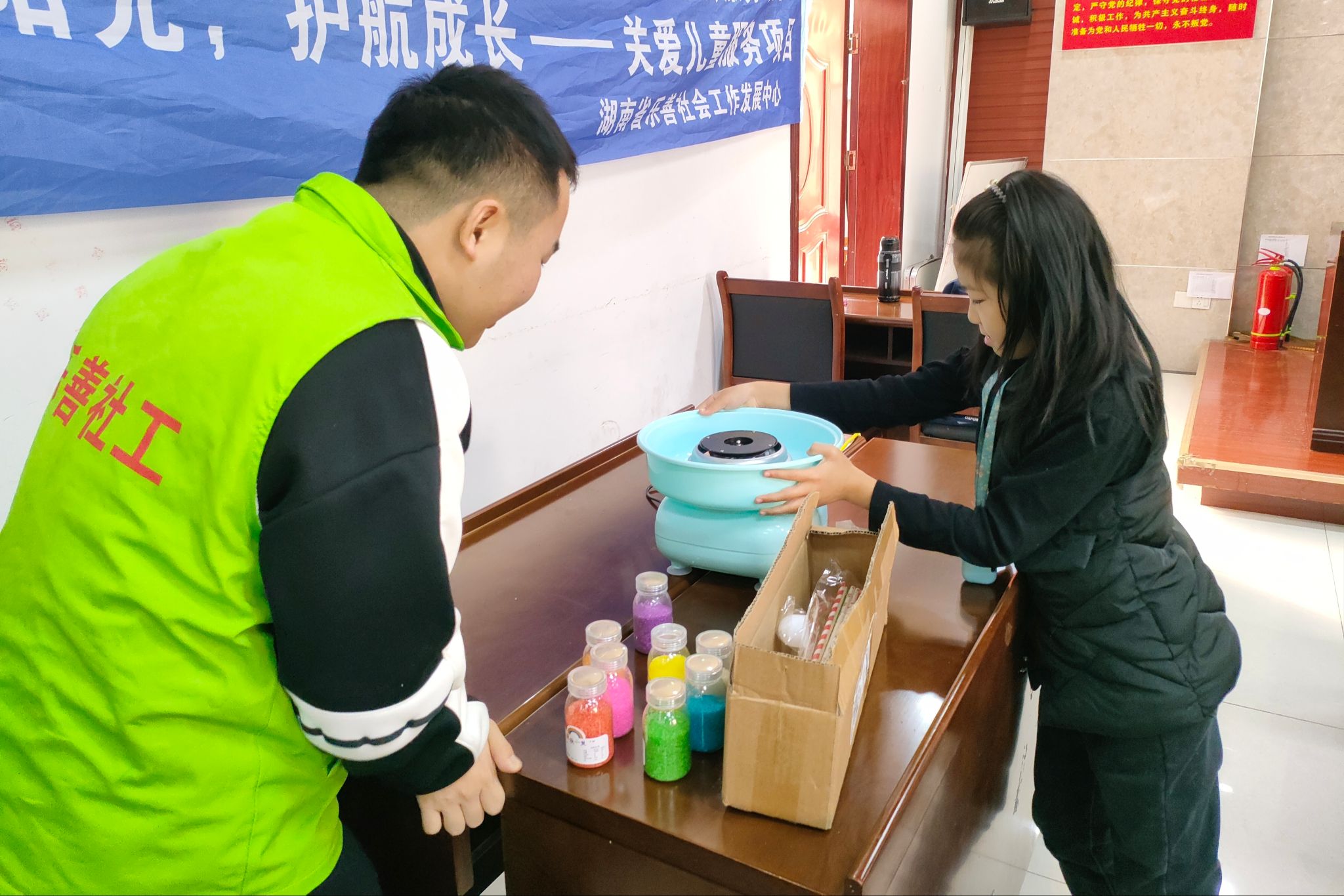 志愿者手把手带领小朋友转动棍棒,制作棉花糖