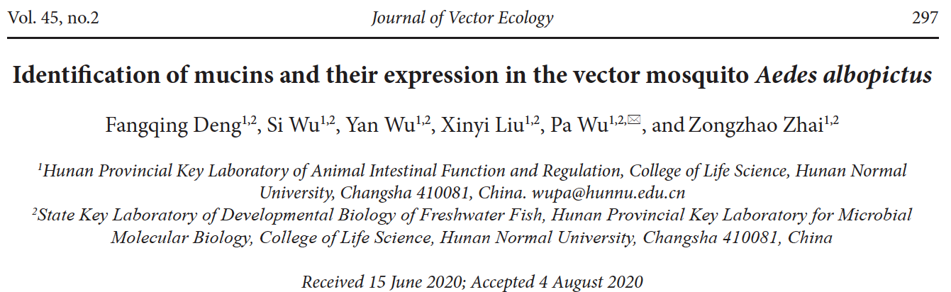(通讯员 高奕)近日,我校生命科学学院2017级生物技术专业本科生邓芳清、生物科学专业本科生吴思等人关于蚊虫黏液素的研究成果于国际媒介生物学期刊Journal of Vector Ecology发表题为“Identification of mucins and their expression in the vector mosquito Aedes albopictus”的论文。