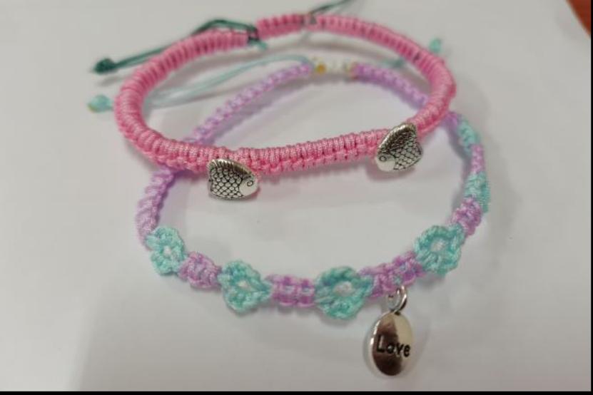 黄道佳结合手链编织的视频教程及自身经验,向社团会员具体介绍不同的编织方法。会员了解基本步骤后,利用活动材料着手进行编织。在理事会成员的协助下,活动成员之间互相交流意见,共同完成绳结手链的创作。活动最后,会员展示制作成品