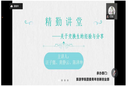 (通讯员 段菲菲 王晗)4月5日晚,旅游学院团委青年创新创业部于线上举办以“交换生经验分享”为主题的精勤讲堂。此次精勤讲堂由赴澳交换生、2019级会展经济与管理专业学生汪子懿,赴澳交换生、2019级国际旅游专业学生黄静云以及澳门城市大学来我校旅游学院交换生、国际旅游与酒店管理专业(会展方向)学生陈泽坤主讲,由青创部部长赵敏主持。