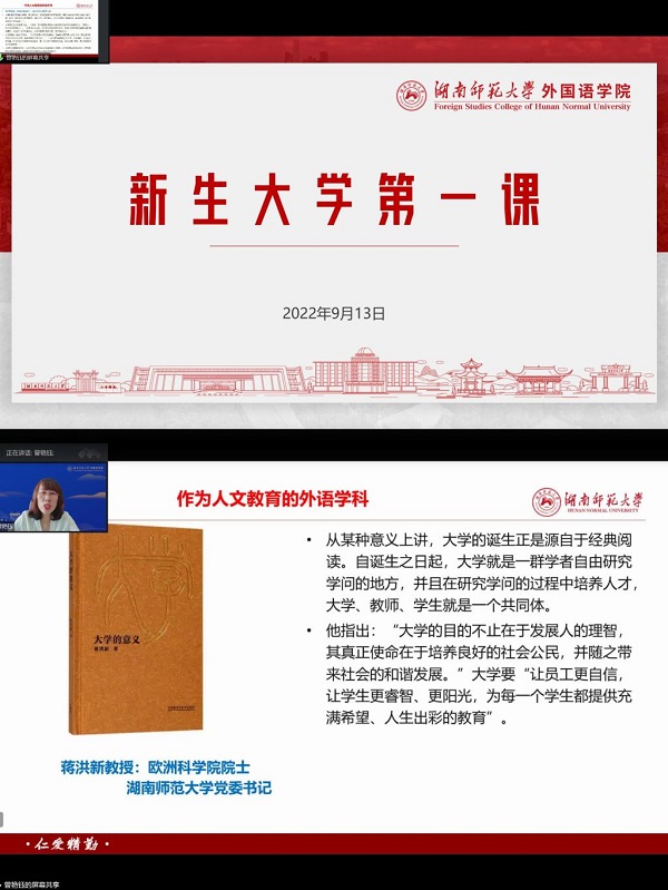 (通讯员 严茳葶)9月13日上午,外国语学院院长曾艳钰教授以“大学的理念与新时代外语人的使命”为主题为外国语学院2022级本科新生讲授“大学第一课”。讲座由学院党委副书记李蜜主持。